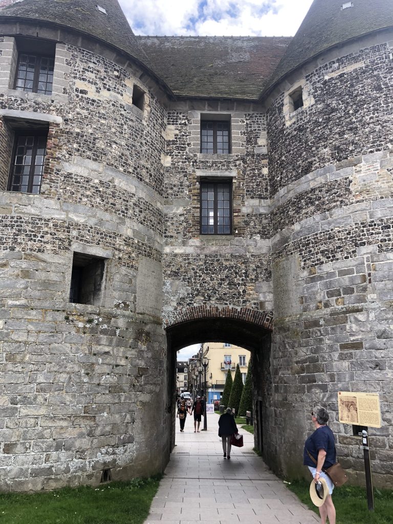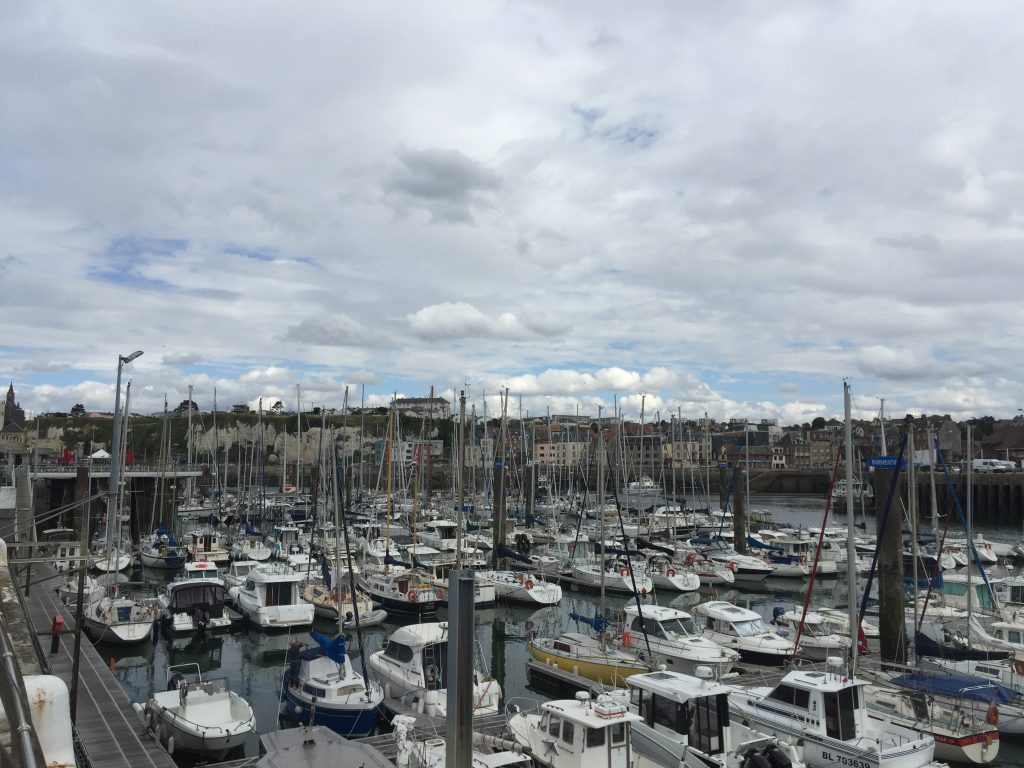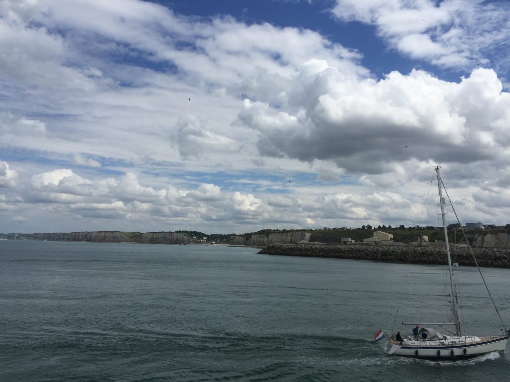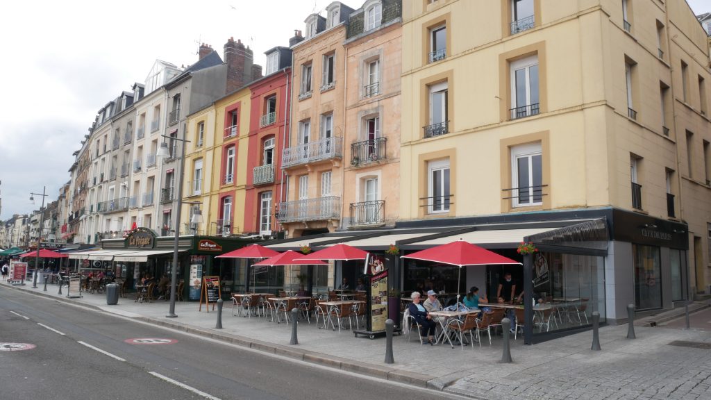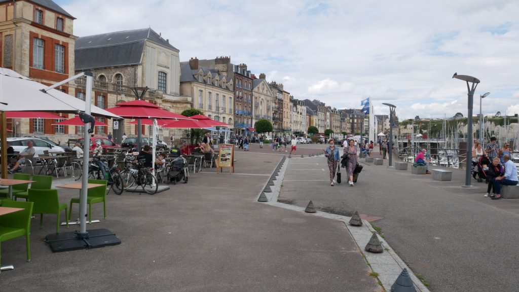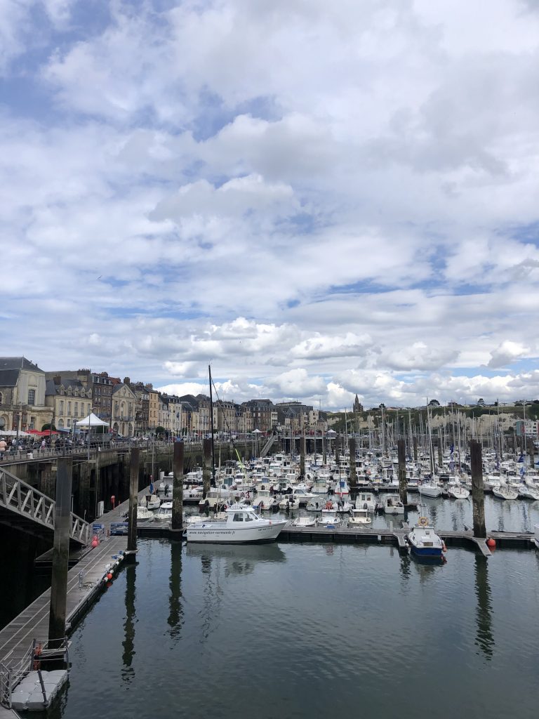 Pour aller à Dieppe, nous continuons cette route côtière bien verte qui passe de plage en falaise. A Dieppe, nous commençons par la plage, très longue et animée mais toujours en galets… Déjeuner de sandwiches dans une baraque de plage puis promenade vers le port. Le frant de mer est grand et bien aménagé. Promenade ensuite dans la ville avec ses rues aimées. Dieppe n’a pas subi les bombardements et reste authentique. Le bassin est entouré de terrasses et un coin agréable.