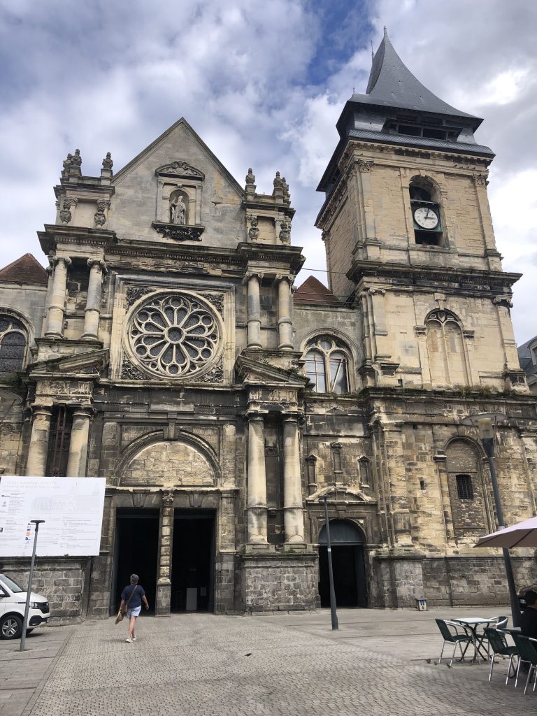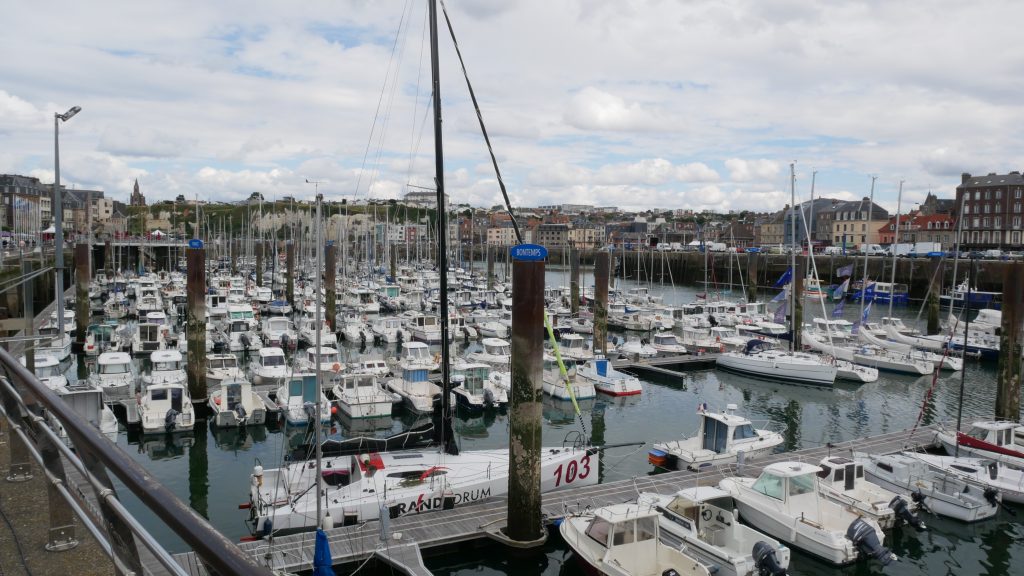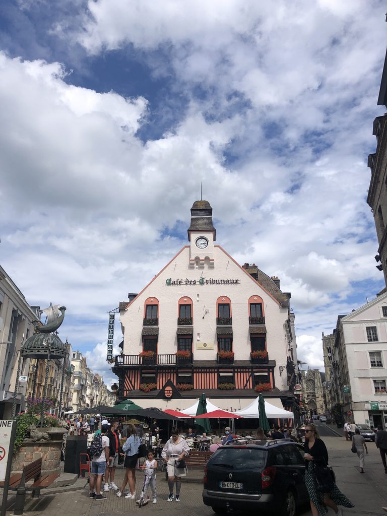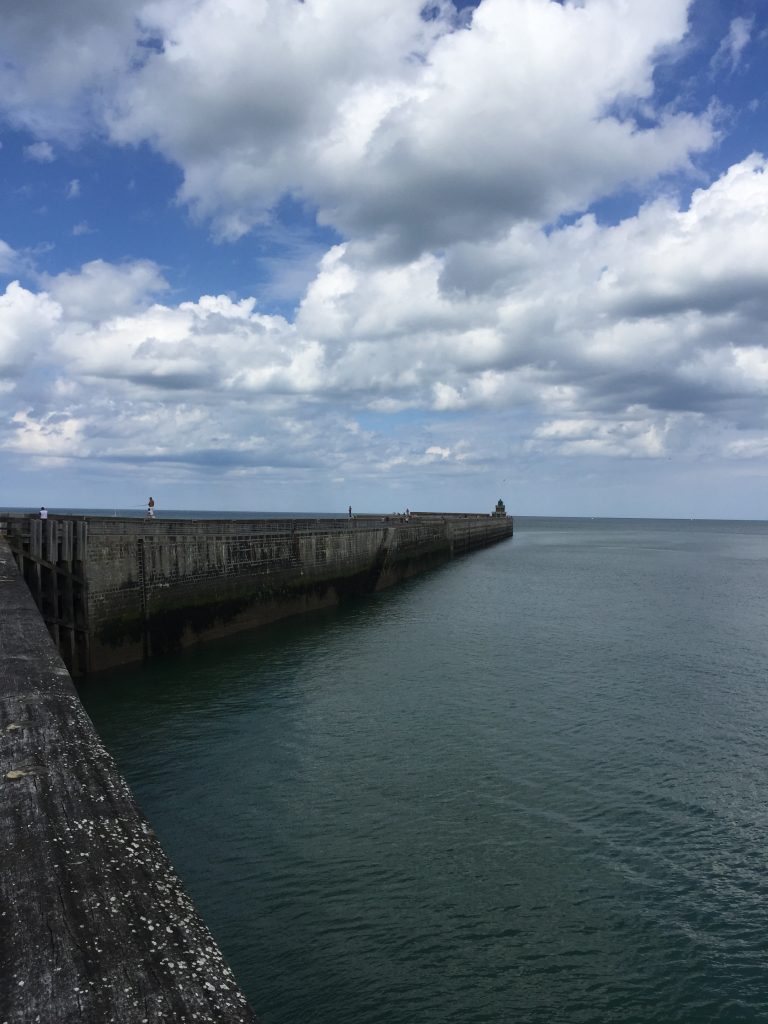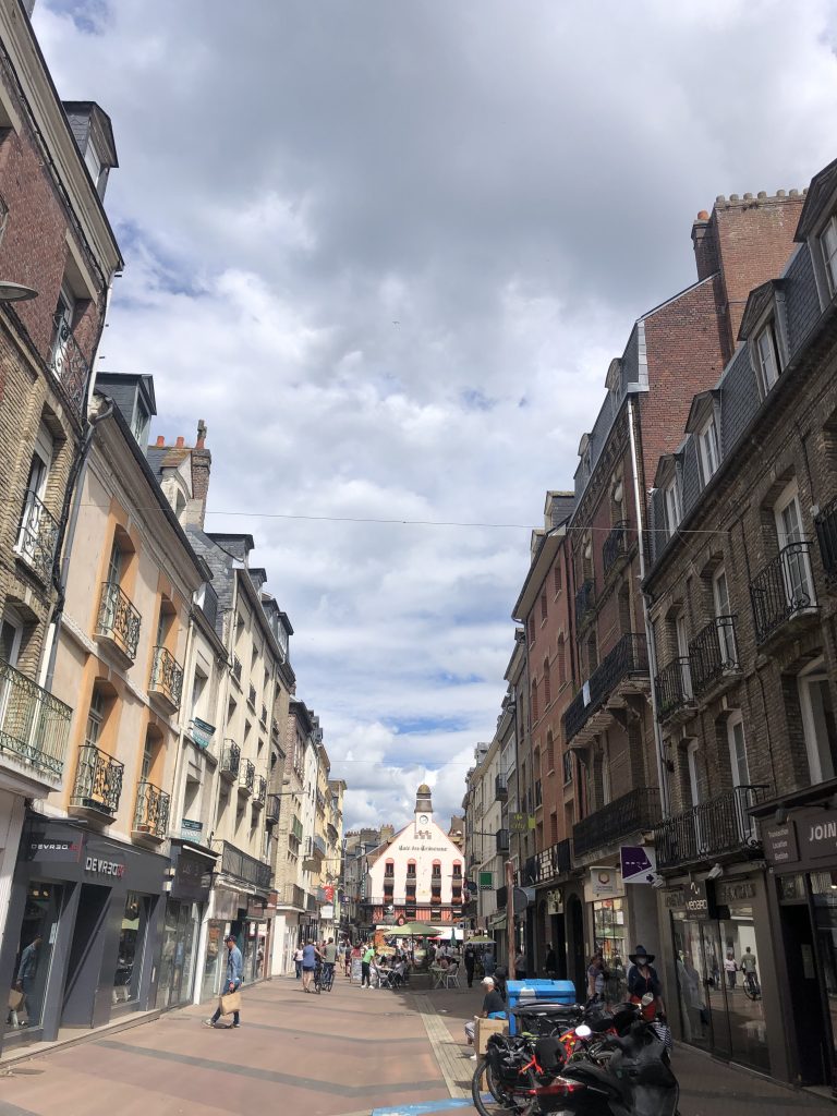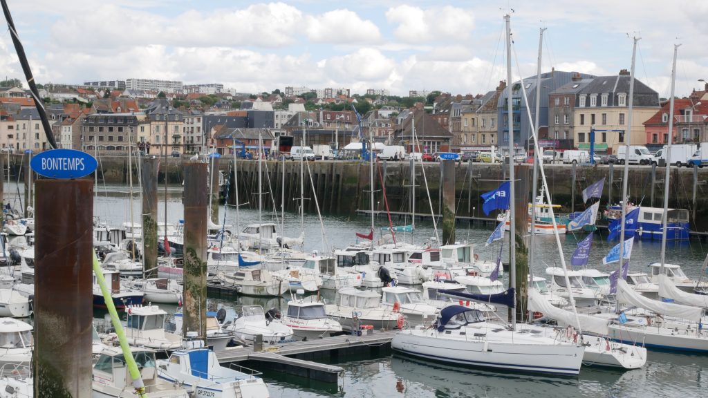Pour aller à Dieppe, nous continuons cette route côtière bien verte qui passe de plage en falaise. A Dieppe, nous commençons par la plage, très longue et animée mais toujours en galets… Déjeuner de sandwiches dans une baraque de plage puis promenade vers le port. Le frant de mer est grand et bien aménagé. Promenade ensuite dans la ville avec ses rues aimées. Dieppe n’a pas subi les bombardements et reste authentique. Le bassin est entouré de terrasses et un coin agréable.