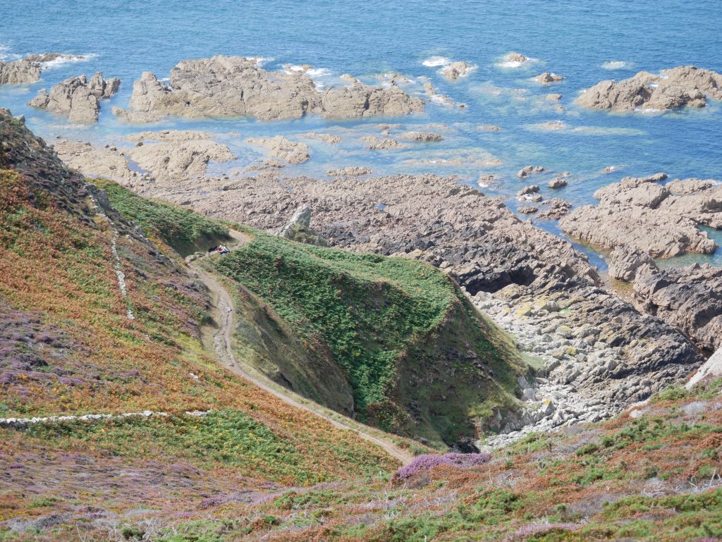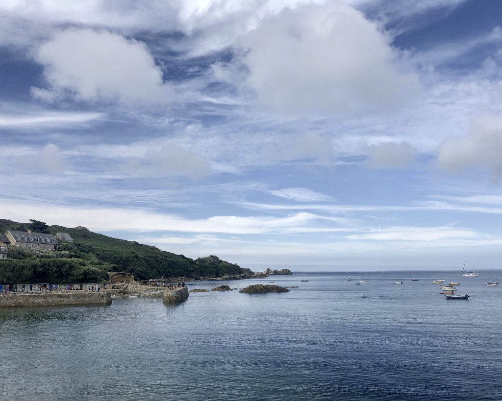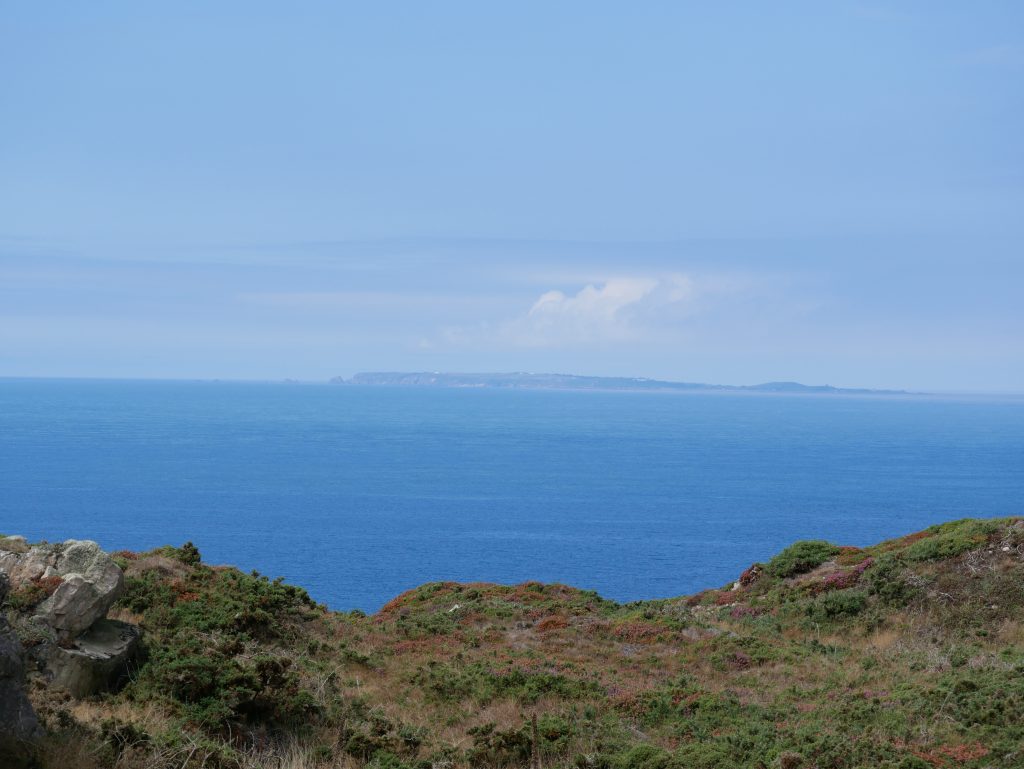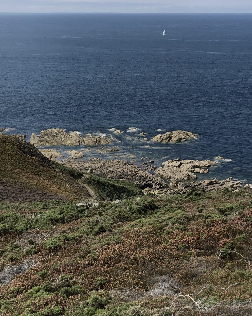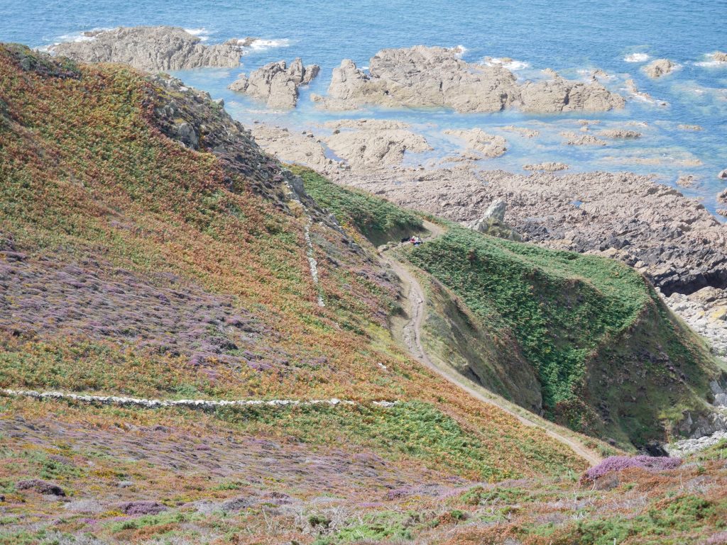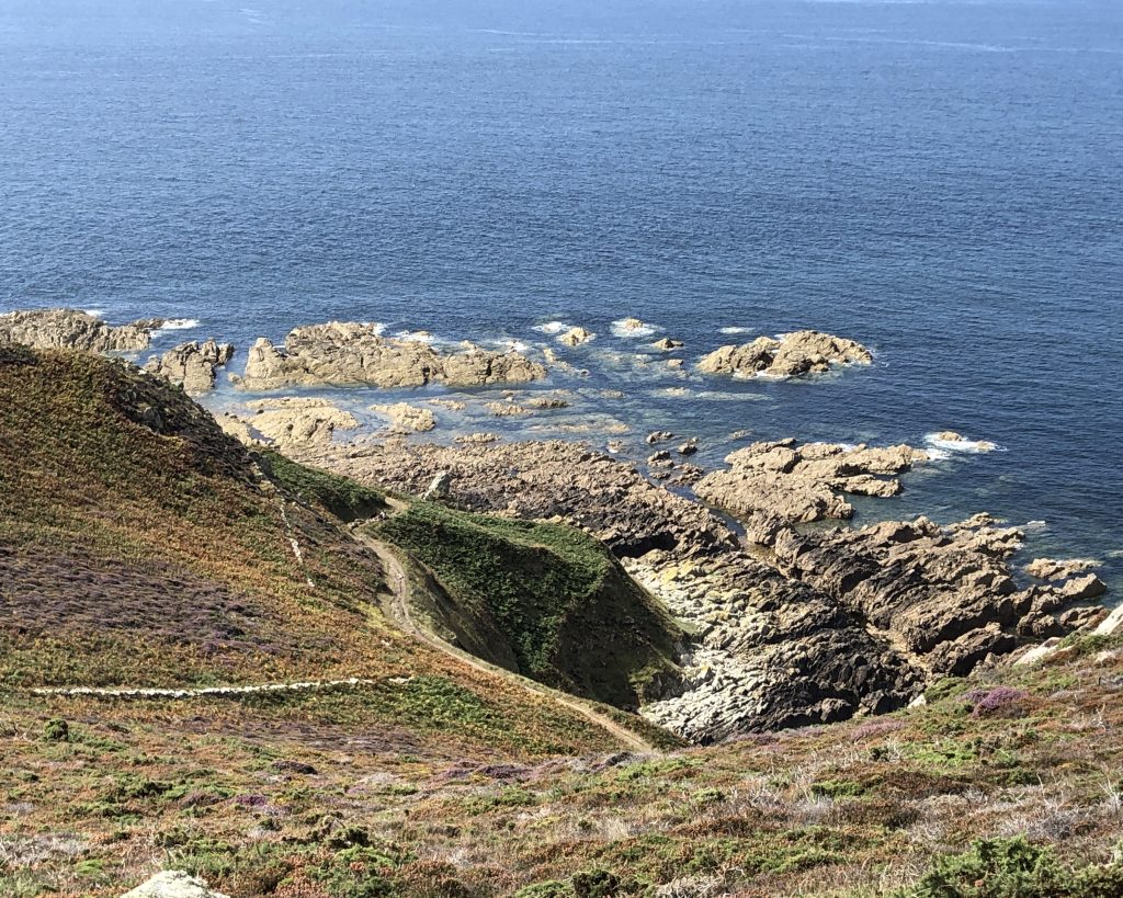 Les falaises sont vraiment hautes et le point de vue vaut le détour. On voit très bien l’ile d’Aurigny en face qui n’est qu’à 19kms. Mais le courant qui circule à cet endroit, le Raz Blanchard est un des courants les plus forts au monde. On voit l’ile de Sark et derrière celle de Guernesey, un peu plus loin on distingue bien Jersey également. Il y a beaucoup de marcheurs sur le sentier du littoral. Ici, on monte et on descend vers la baie d’Ecalgrain. La lande est fleurie de bruyères. Un peu plus loin le petit port pittoresque de Goury, on y déjeune.