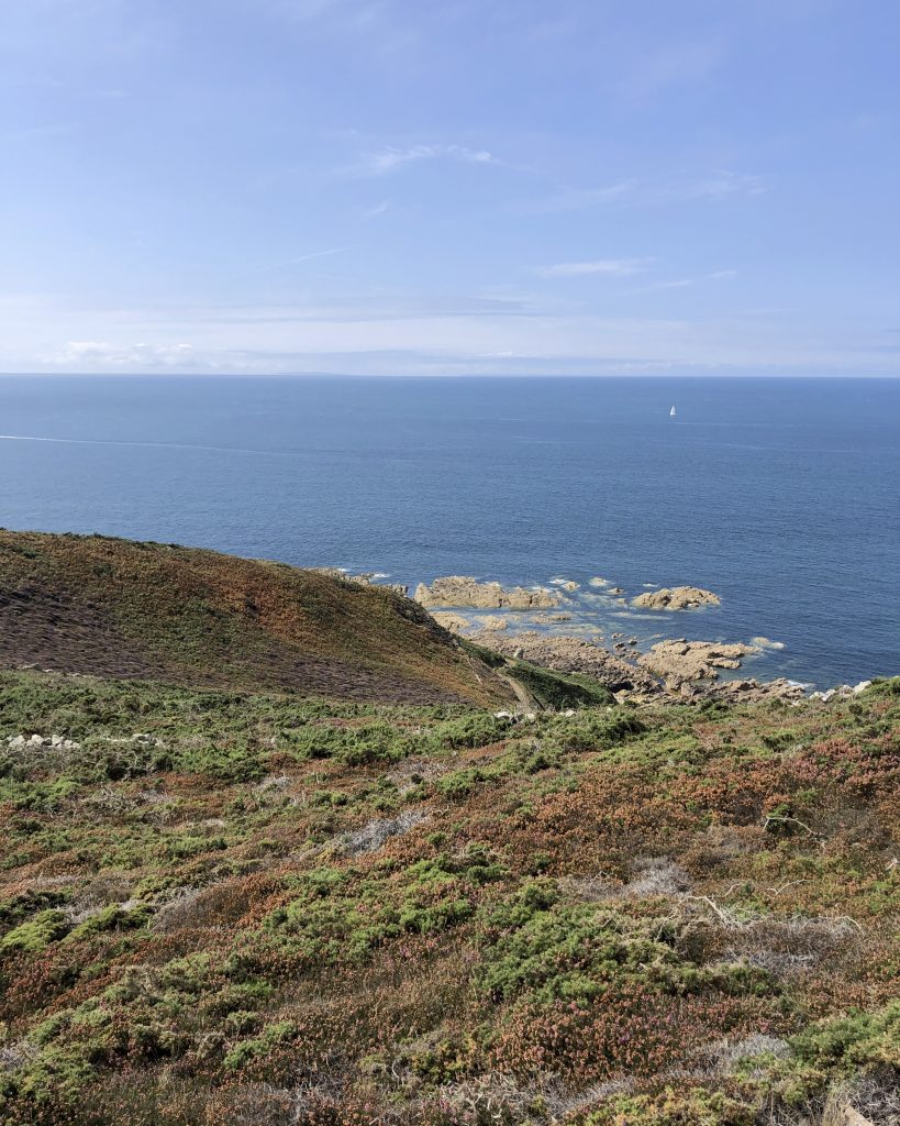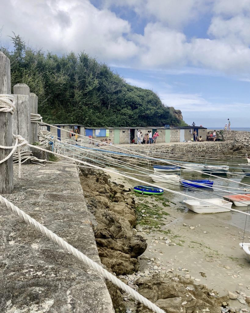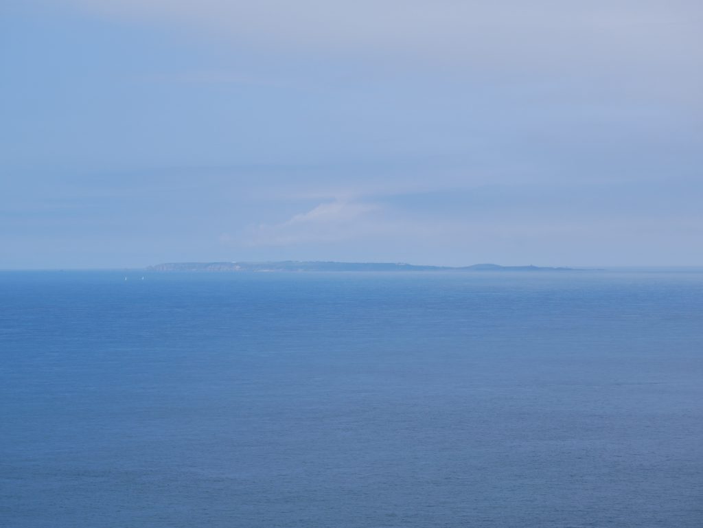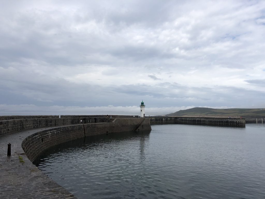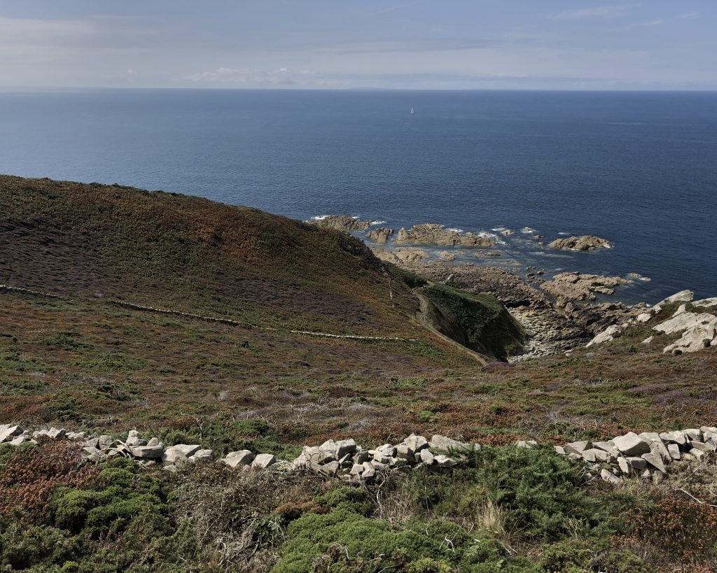 Les falaises sont vraiment hautes et le point de vue vaut le détour. On voit très bien l’ile d’Aurigny en face qui n’est qu’à 19kms. Mais le courant qui circule à cet endroit, le Raz Blanchard est un des courants les plus forts au monde. On voit l’ile de Sark et derrière celle de Guernesey, un peu plus loin on distingue bien Jersey également. Il y a beaucoup de marcheurs sur le sentier du littoral. Ici, on monte et on descend vers la baie d’Ecalgrain. La lande est fleurie de bruyères. Un peu plus loin le petit port pittoresque de Goury, on y déjeune.