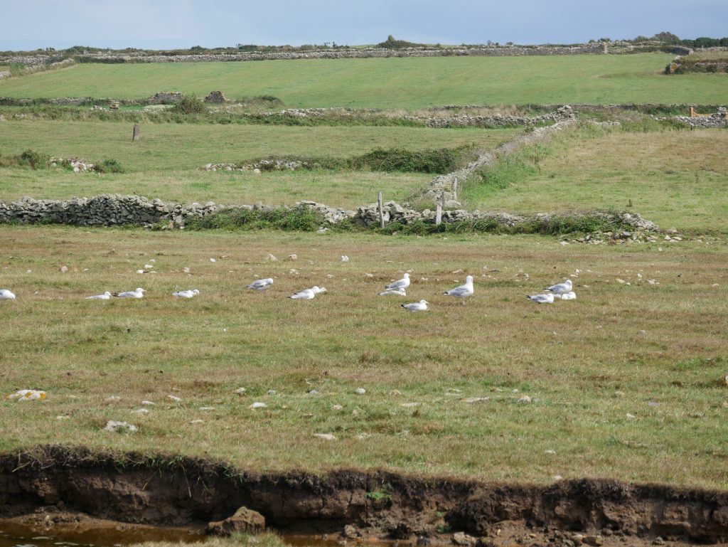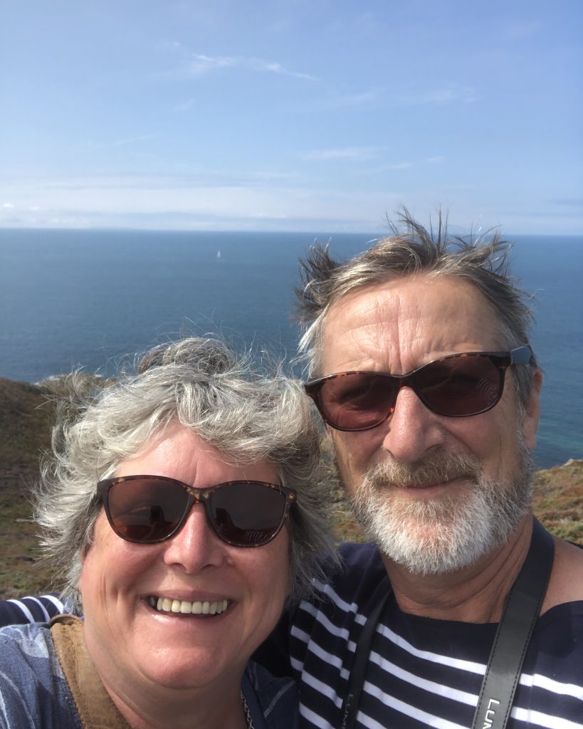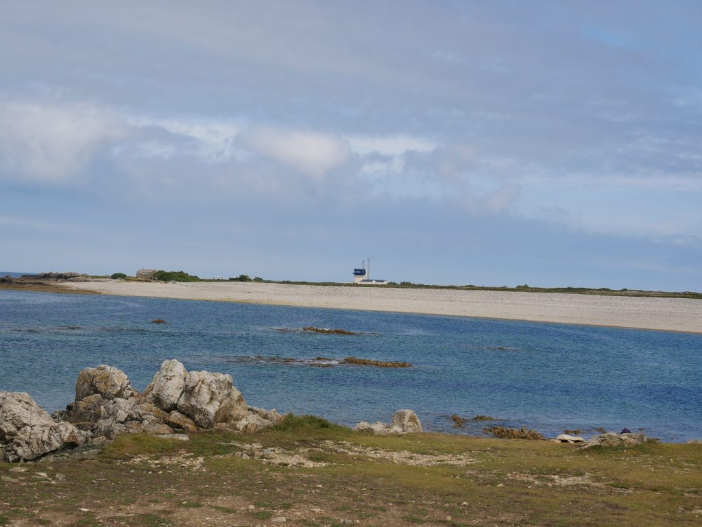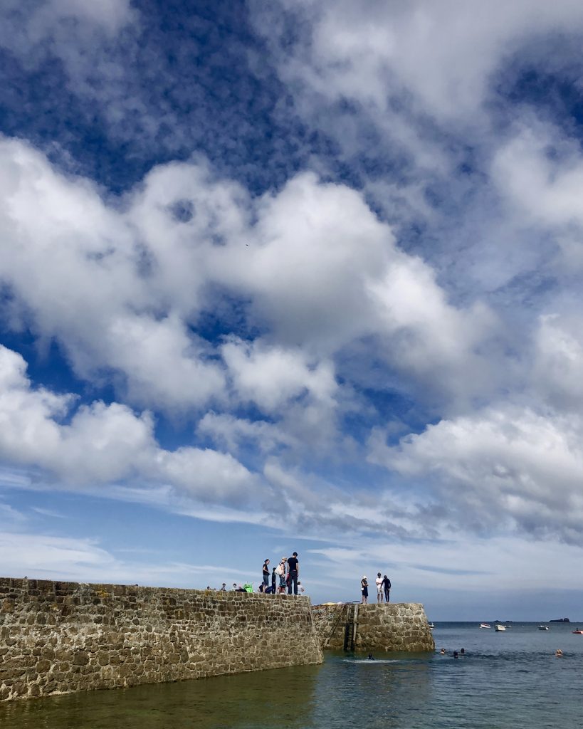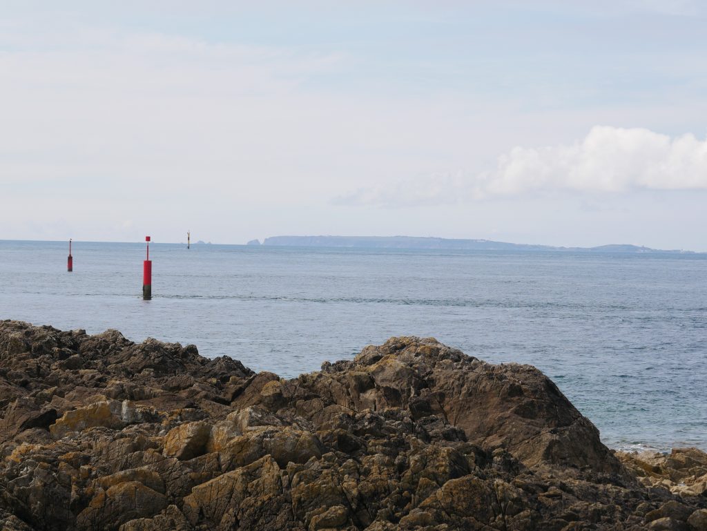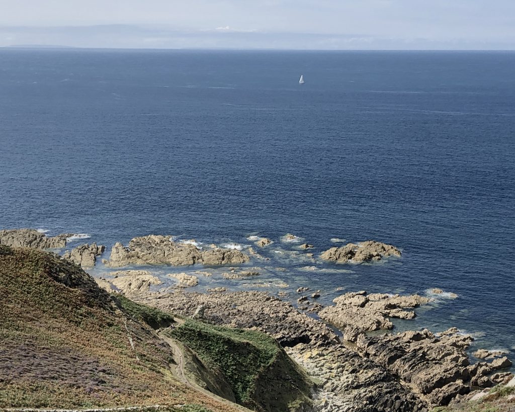 Les falaises sont vraiment hautes et le point de vue vaut le détour. On voit très bien l’ile d’Aurigny en face qui n’est qu’à 19kms. Mais le courant qui circule à cet endroit, le Raz Blanchard est un des courants les plus forts au monde. On voit l’ile de Sark et derrière celle de Guernesey, un peu plus loin on distingue bien Jersey également. Il y a beaucoup de marcheurs sur le sentier du littoral. Ici, on monte et on descend vers la baie d’Ecalgrain. La lande est fleurie de bruyères. Un peu plus loin le petit port pittoresque de Goury, on y déjeune.