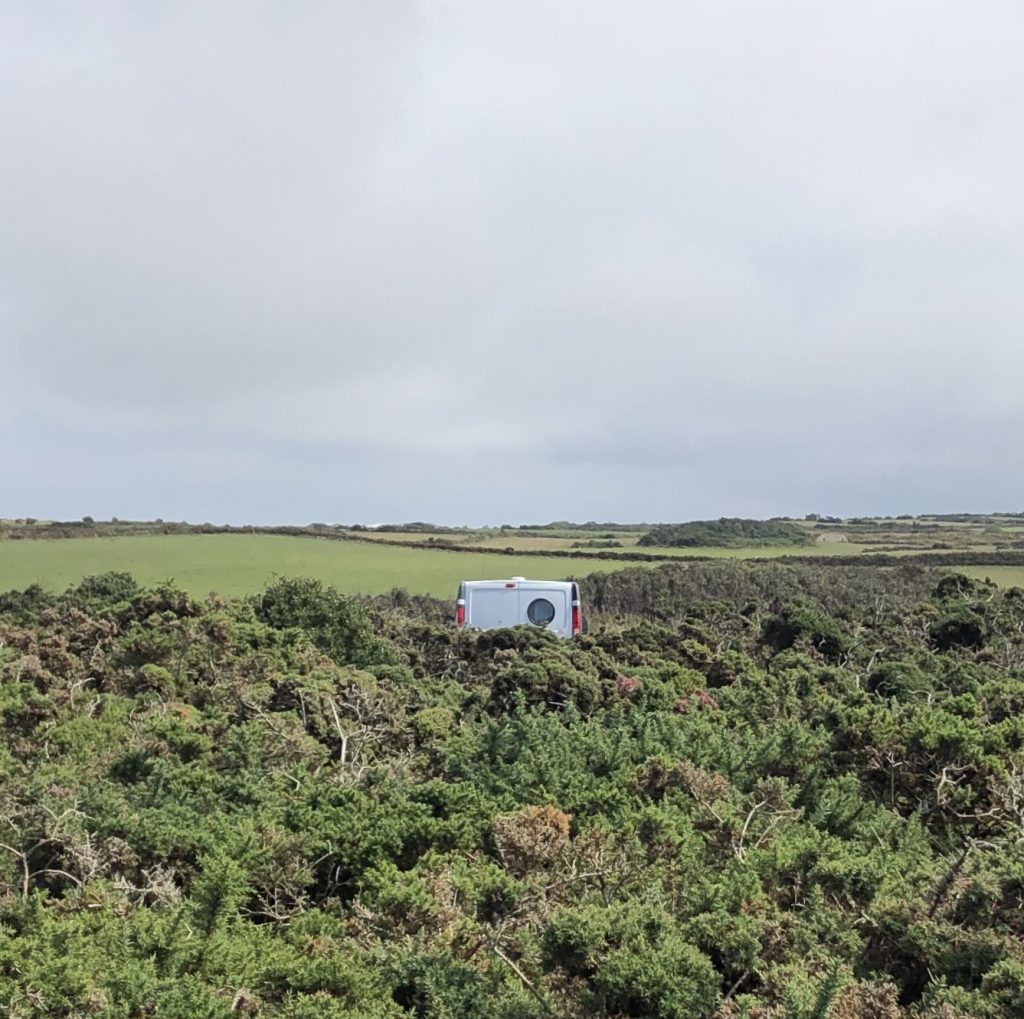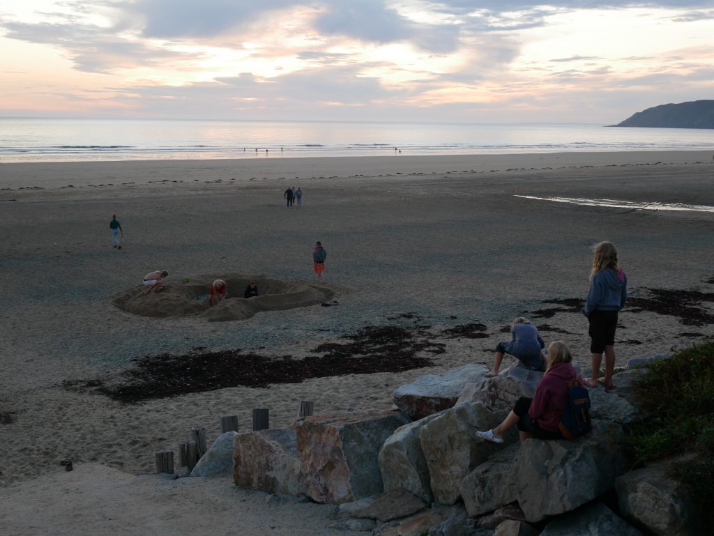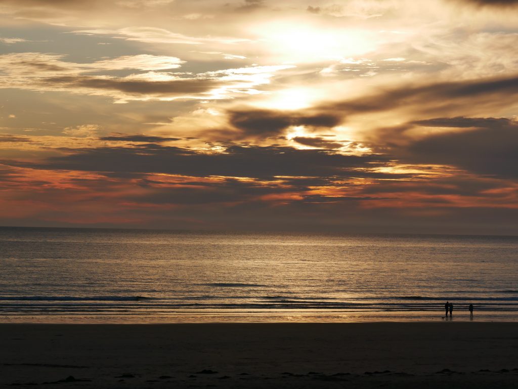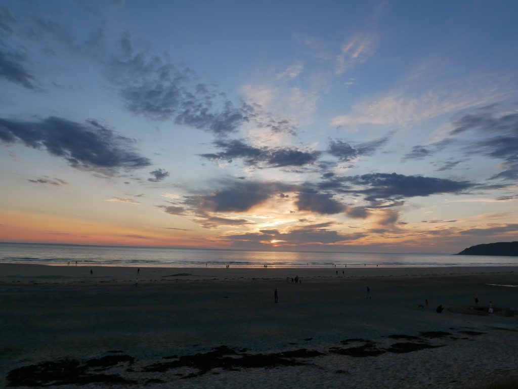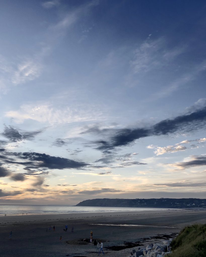 Nous cherchons un camping du côte de Barneville-Casteret. Il y a des falaises et de belles plages. Nous nous posons au grand large, au Rozel. Une très grande plage est au bout du camping, la mer est basse mais j’en profite pour me baigner. Au loin on distingue Jersey et Guernesay. Le ciel s’assombrit et il commence à pleuvoir en début de soirée. Il ne fait pas froid mais le vent s’est levé et on doit se battre avec les éléments pour que notre voile tienne debout car les piquets sont plantés dans le sable et ils ont tendance à se déterrer facilement. Une fois les poches d’eau vidées et le tout consolidé, on parvient même à se faire des grillades dans des conditions un peu épiques…