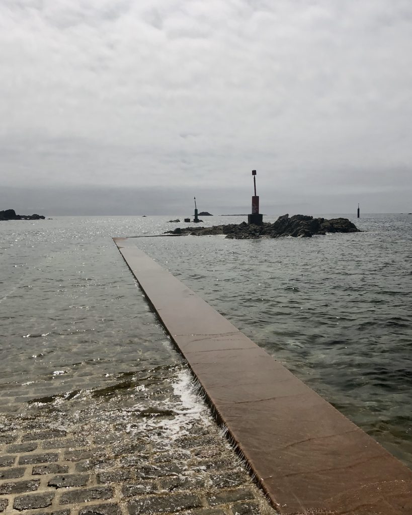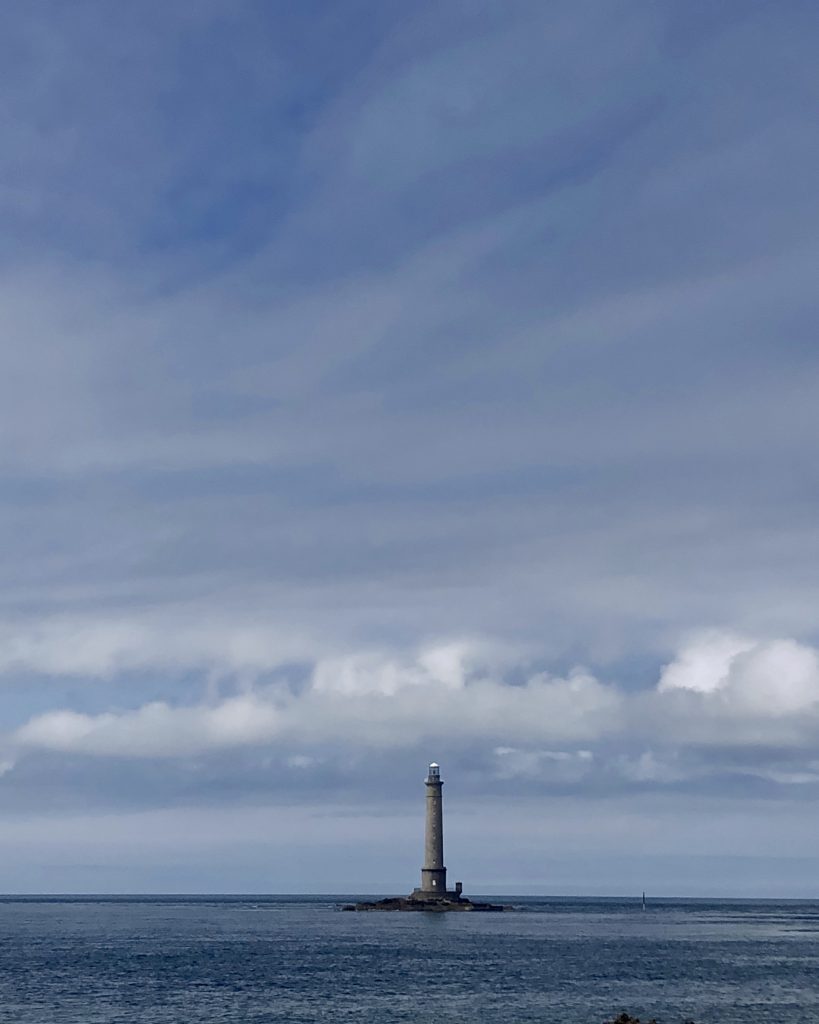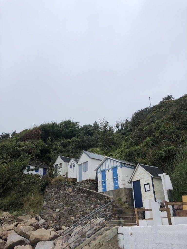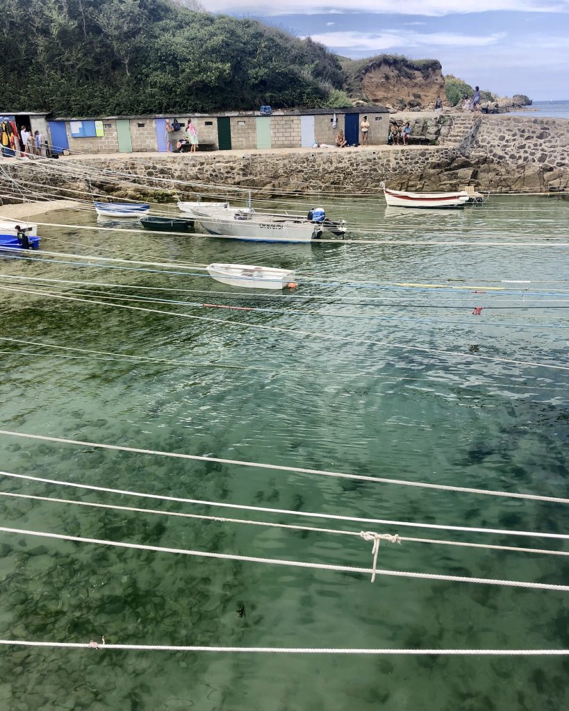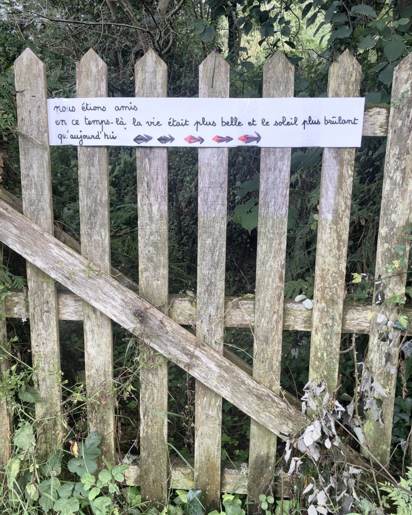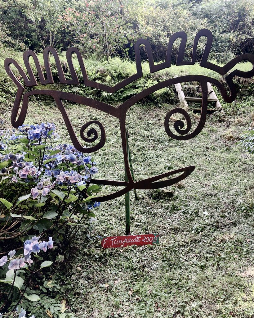 En suivant la côte, on fait escale à port Racine, le plus petit port en activité de France. La mer est haute, je me baigne. De Port Racine, un sentier nous mène au jardin en hommage à Jacques Prévert. C’est le propriétaire, ami de Prévert qui nous accueille en personne. Le jardin est un peu hétéroclite car ce sont les amis du poète qui y ont planté des arbres mais la promenade est apaisante. Des panneaux proposent des vers ou des poèmes de Prévert. On y trouve de belles espèce d’hydrangeas et des orchidées que butinent des abeilles. Le jardin comporte aussi quelques sculptures et des bancs pour méditer ou lire le livre de souvenirs qui nous a été confié à l’entrée.