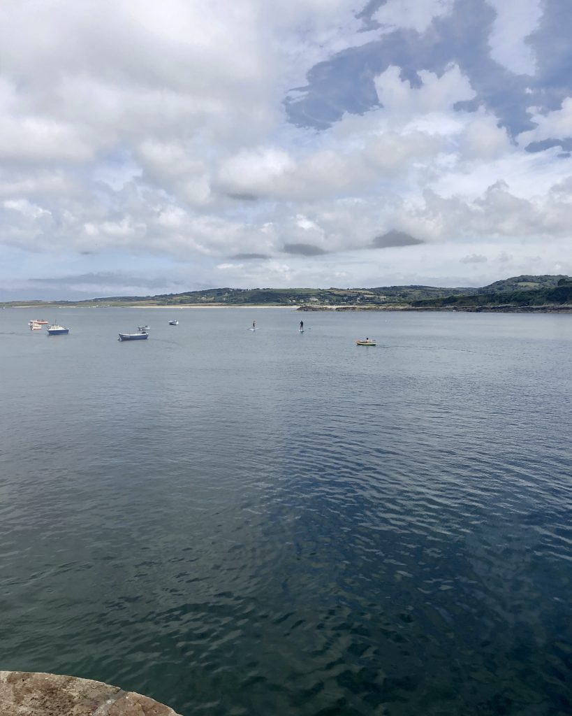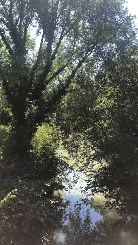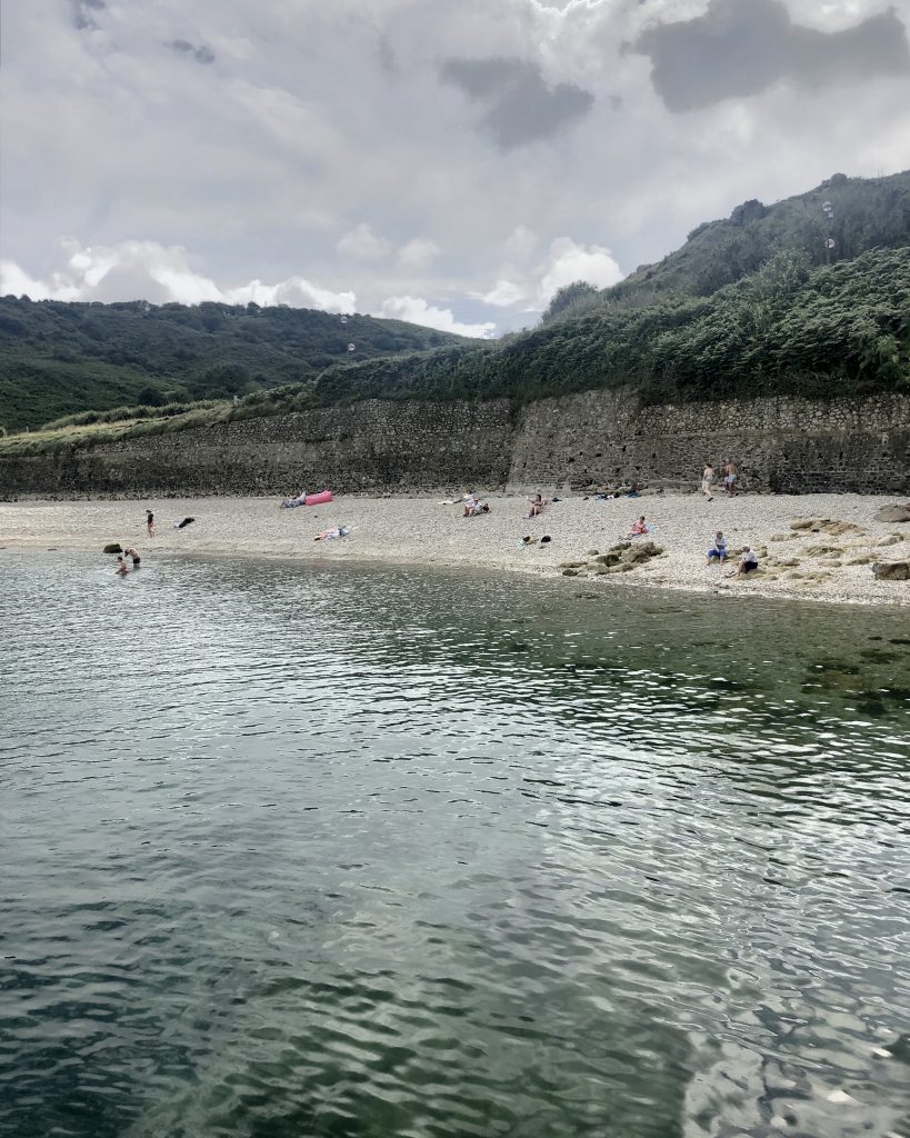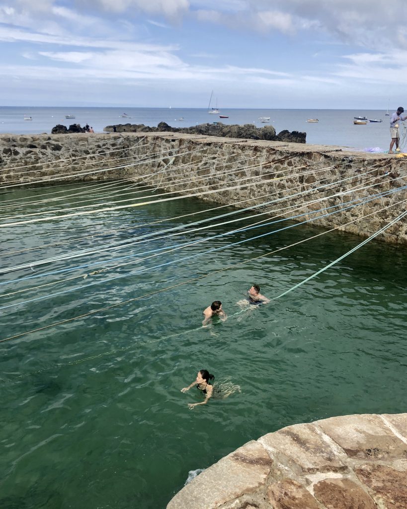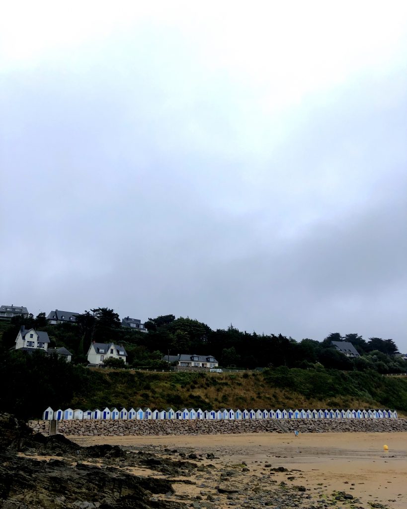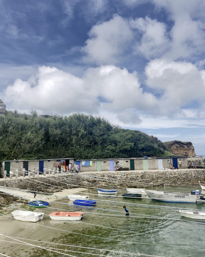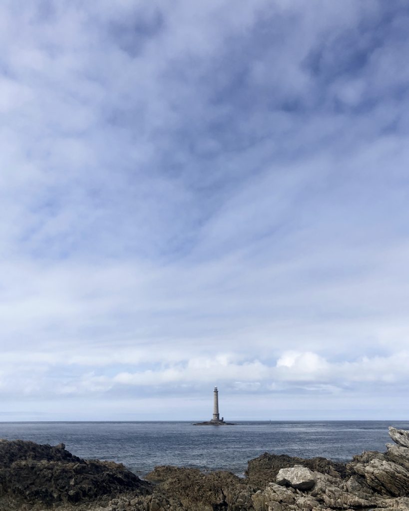 En suivant la côte, on fait escale à port Racine, le plus petit port en activité de France. La mer est haute, je me baigne. De Port Racine, un sentier nous mène au jardin en hommage à Jacques Prévert. C’est le propriétaire, ami de Prévert qui nous accueille en personne. Le jardin est un peu hétéroclite car ce sont les amis du poète qui y ont planté des arbres mais la promenade est apaisante. Des panneaux proposent des vers ou des poèmes de Prévert. On y trouve de belles espèce d’hydrangeas et des orchidées que butinent des abeilles. Le jardin comporte aussi quelques sculptures et des bancs pour méditer ou lire le livre de souvenirs qui nous a été confié à l’entrée.