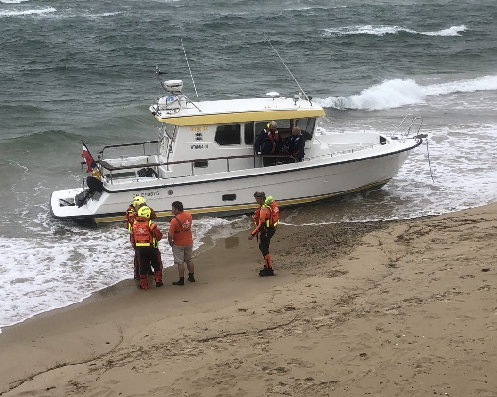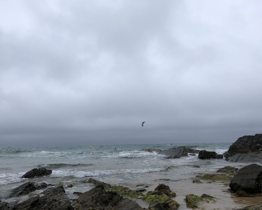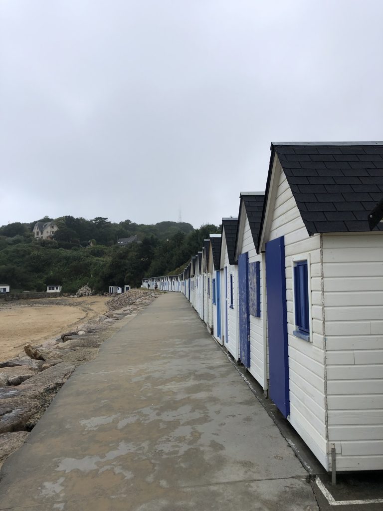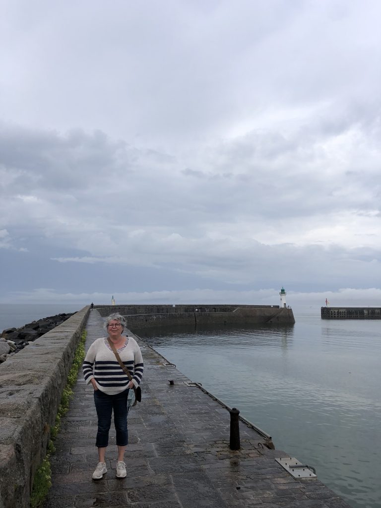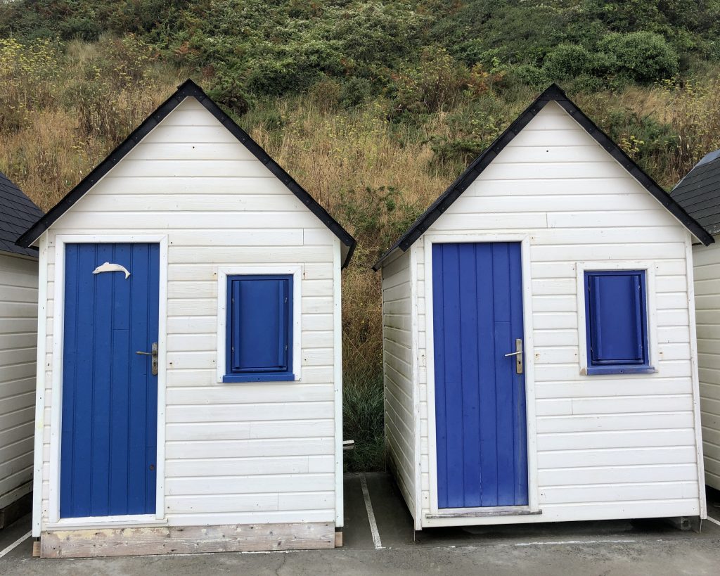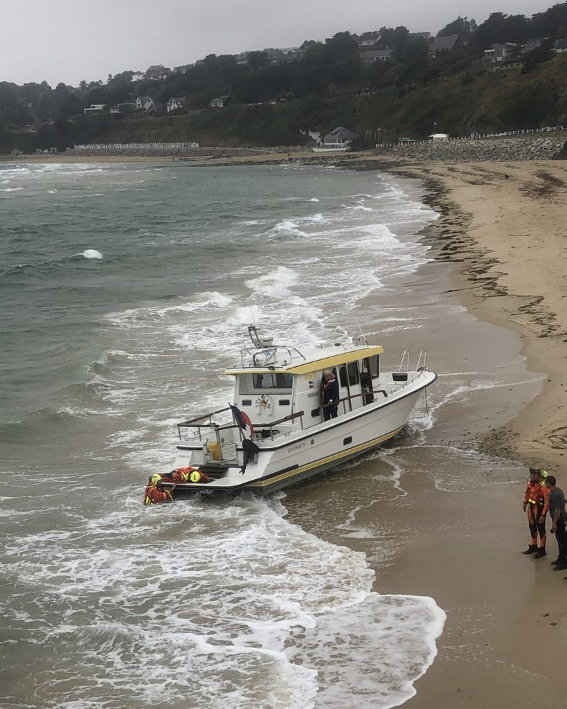 Journée grise et pluvieuse, on se lève dans le brouillard. Nous attendrons demain pour aller à la pointe de Jobourg. Nous décidons de visiter Barneville Carterets. Après la digue, il y a une belle plage avec de jolies petites cabines blanches et bleues. Le ciel est chargé, les Kitesurfs sont de sortie. Curieux : un petit bateau a l’air échoué sur un banc de sable. On s’approche et on observe un moment les pompiers essayer de dégager l’hélice de l’embarcation qui s’est prise dans un casier. C’est marée haute, le bateau est balloté dans tous les sens. Rien à faire. Le moteur semble ne pas vouloir redémarrer.
