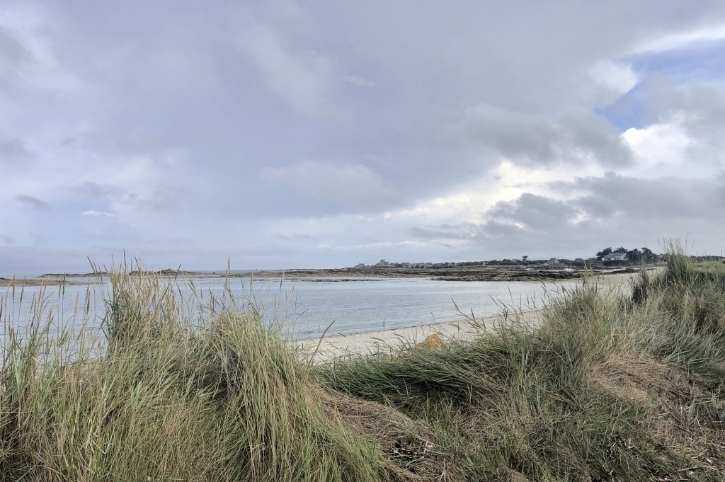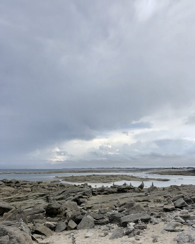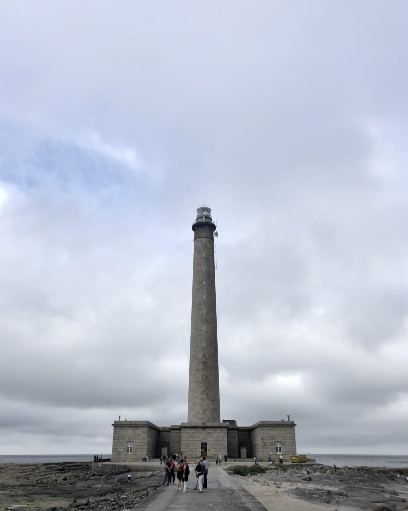 Il a plu une grande partie de la nuit précédente, les nuages sont noirs et menaçants mais il ne fait pas froid et surtout ils n’ont pas l’intention d’éclater ! J’en profite pour ma baigner dans la petite anse du camping. Ensuite, nous nous rendons au phare. C’est le deuxième phare le plus grand de France, 75 mètres, tout en granit. Il est fermé pour cause de menace orageuse mais pas sûre que nous aurions eu le courage de monter toutes les marches !