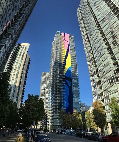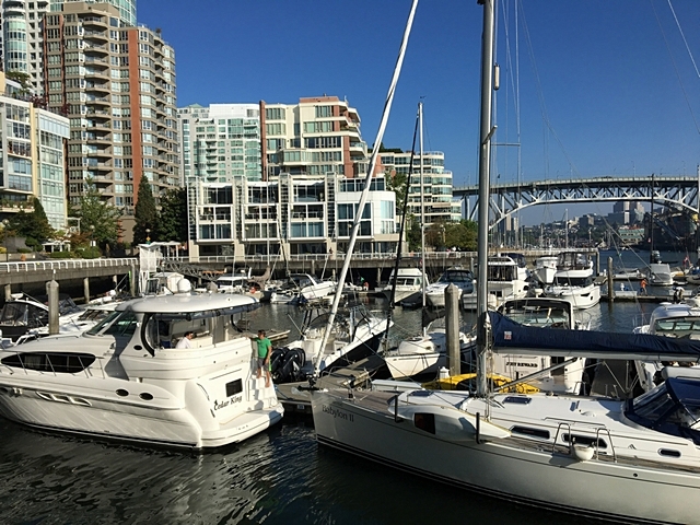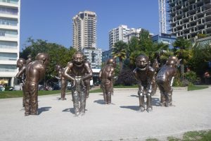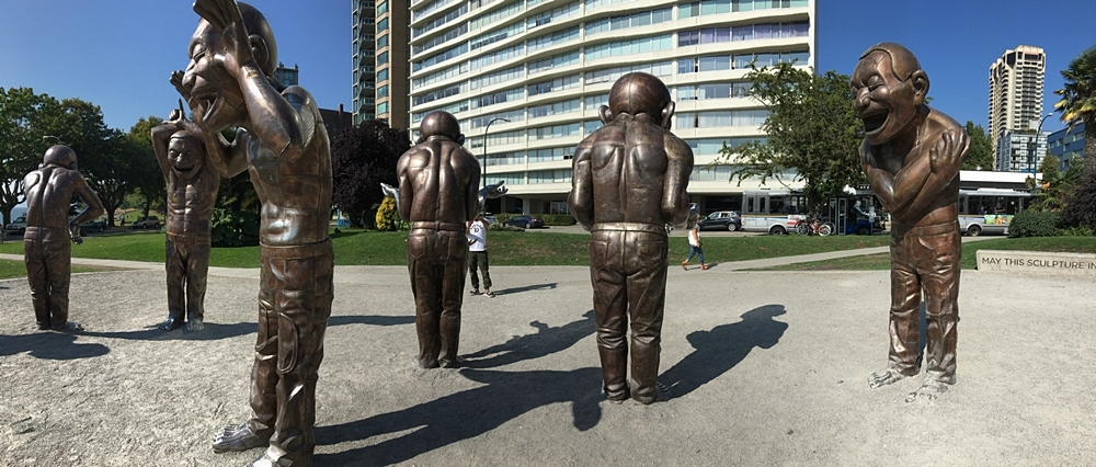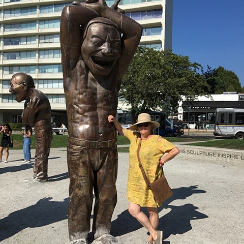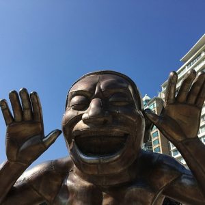 On revient à Westend pour prendre un verre et s’attarder au niveau des statues géantes d’un homme hilare : Amazing Laughter. Sarah nous laisse et nous donne rendez-vous plus tard pour le diner. Nous longeons English Bay. C’est très joli ces plages et ce port de plaisance en plein centre-ville, de petites navettes traversent la baie, certains font du paddle, du canoé ou du volley sur la plage. C’est le royaume des chiens, il y en a partout, ils ont même des parcs rien que pour eux.