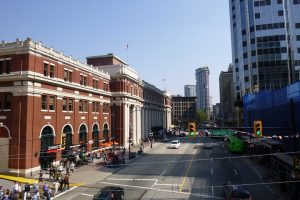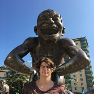 On a décidé de se mettre en route vers 9h30 pour le musée d’anthropologie de l’UBC (University of British Columbia), le MOA. Celui-ci se trouve au bout de la presqu’ile de Vancouver. Stéphane regarde dans son téléphone, cela fait 20 kms. Cette ville est très étendue. Dans le guide, il est dit que Vancouver est la 4ème ville d’Amérique du Nord. On se dit qu’on va attraper un taxi mais aucun ne passe. On se lance, on va prendre le bus. Des passants très gentils nous recommandent le 95, c’est un express pour downtown. Il faut payer son ticket en pièces avec le montant exact dans une machine en montant dans le bus. Evidemment, nous n’avons pas assez monnaie pour 5. Les gens sont très gentils, une dame donne de l’argent pour Loïs et Basile, c’est le chauffeur qui nous dit que ça ne vaut pas le coup de payer ! Tout le bus se mobilise pour nous trouver un itinéraire. C’est finalement le chauffeur qui nous conseille d’aller au terminus de ce bus puis de prendre un autre bus express, le 44 qui va jusqu’à l’université. On a le temps d’observer… A un moment, le bus traverse Hastings. Il y a plein de personnes installées par terre dans la rue, c’est crad, c’est choquant. On est à deux pas des grands immeubles du centre-ville. Une dame m’explique que c’est une catastrophe et que le phénomène est assez récent. C’est la crise du logement et il y a beaucoup de SDF. Selon elle, c’est parce que les Chinois ont tout acheté, elle ajoute qu’il ne reste plus rien pour les blancs. Sarah confirmera en partie ce phénomène. Il y a aussi des toxicomanes, qui viennent d’un peu partout car l’hiver est plus clément à Vancouver qu’ailleurs.