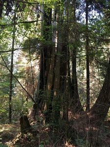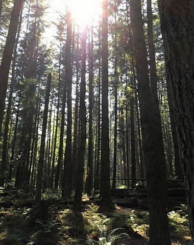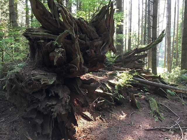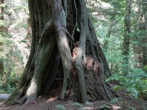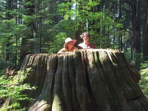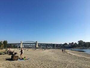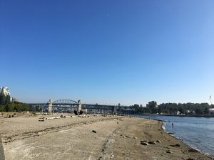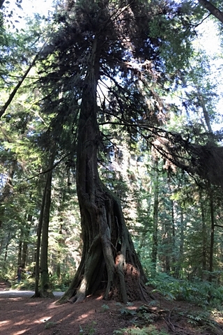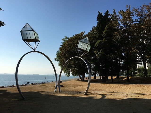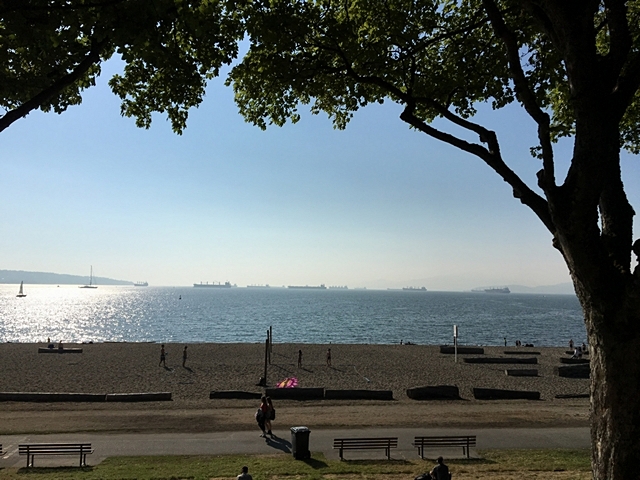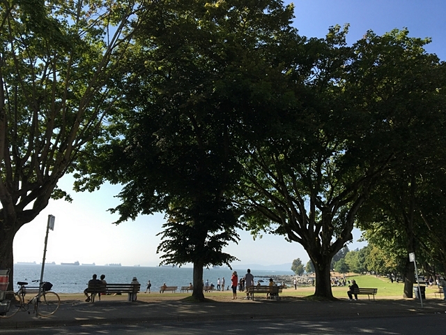 Sarah nous rejoint, nous mangeons un sandwich au musée. Elle est venue en voiture. Nous nous y entassons (à 6) pour faire un tour. On s’arrête aux Spanish Banks où les Espagnols ont débarqué en 1791, ce sont de belles plages qui donnent sur English bay, puis nous allons à Stanley Park, le poumon vert de la ville de 400 ha, un très beau parc avec des arbres très haut, d’énormes vielles souches. On peut en faire le tour à vélo ou à pied mais attention, chacun sa piste, on se fait klaxonner si on n’est pas au bon endroit !