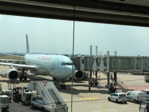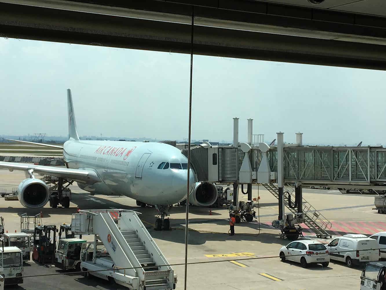Premières péripéties et premières frayeurs. Il fait chaud, la journée est classée en alerte orange en ile de France pour la canicule. Le train a déjà du retard à Angers et il roule lentement. On est supposés arriver à Roissy Charles de Gaule à 11h11. A Massy, le TGV s’arrête longuement puis repart et tombe en panne en pleine campagne. Plus d’électricité, plus de climatisation. On nous annonce qu’on va essayer de le pousser. Les passagers commencent à échanger. Evidemment tout le monde a un train à prendre. Les personnes devant nous partent au Viêt-Nam. Embarquement à 12h30. Un couple avec un enfant part en Grèce. Idem embarquement à 12h30. Pour nous, l’embarquement est à 14h25. Enregistrement à 14h10 max.