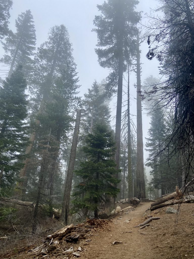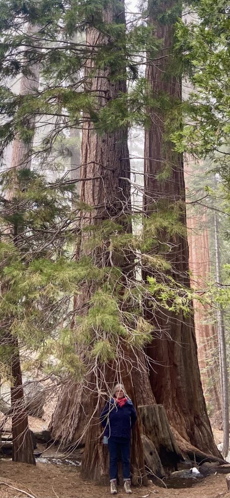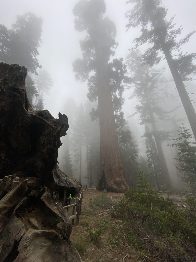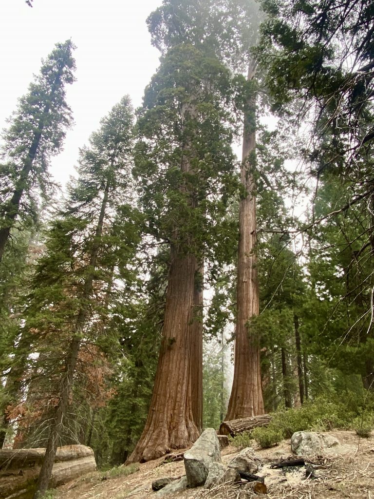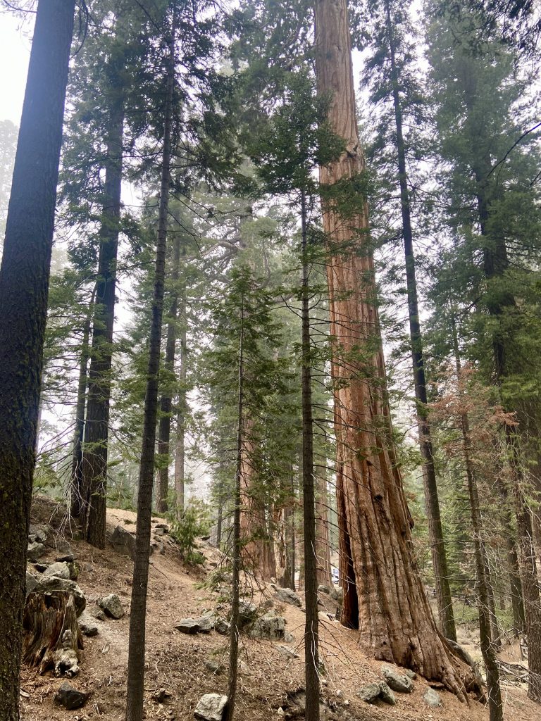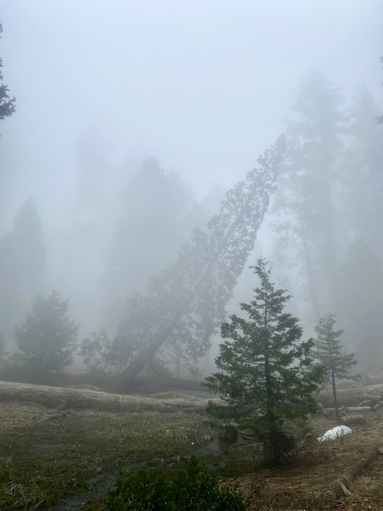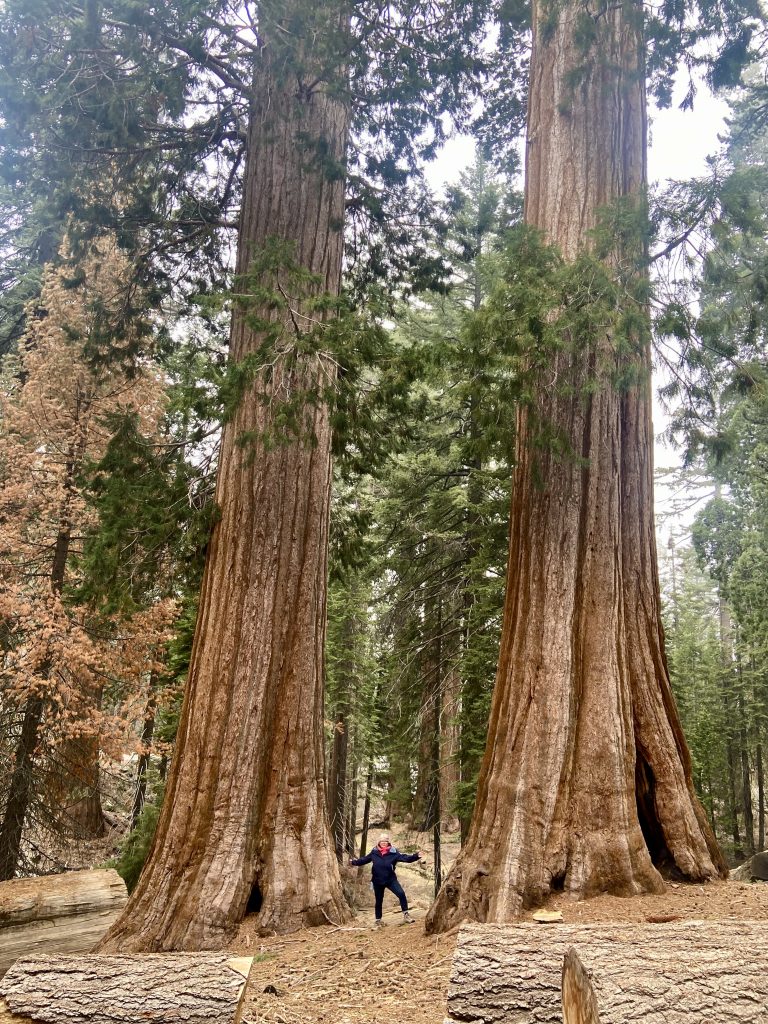 Changement de décor et changement de météo. Ne vous fiez pas aux températures indiquées, on a peu de réseau dans la montagne et on n’est pas géolocalisé avec précision. Le ciel est couvert et plus nous grimpons, plus nous sommes dans les nuages. Nous faisons escale à Grant Grove Village à l’entrée de Kings Canyon. On est à 2000 mètres d’altitude et la température est de 10 degrés. On s’installe à Azalea Campground, un camping de haute montagne. Pas grand monde ici, des tentes et des marcheurs. Il y a de la neige par endroits. Au visitor center, nous apprenons que la scenic byway n’ouvrira pas avant le 25/04, nous pourrons prendre la general highway mais pas jusqu’au bout car elle est interdite aux véhicules de plus de 22 pieds et le nôtre en fait 27. Dès l’entrée du parc, on est impressionnés par la taille des arbres. On va quand même pouvoir faire de belles balades ici.
