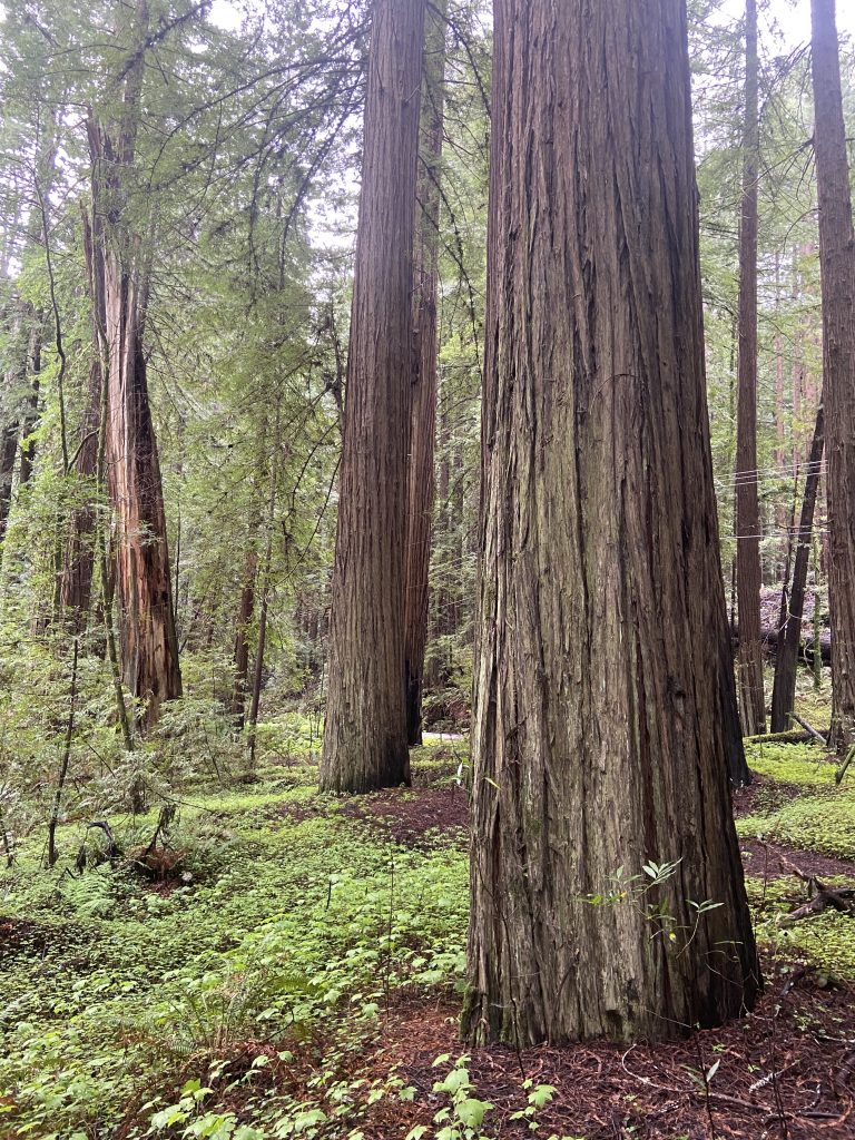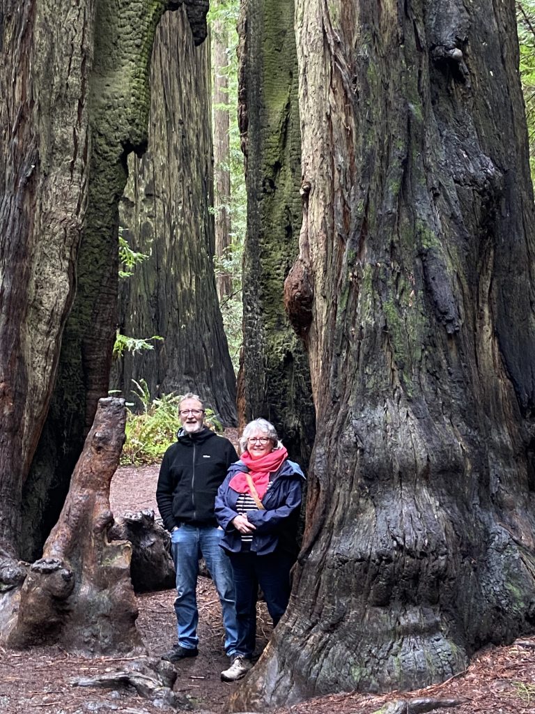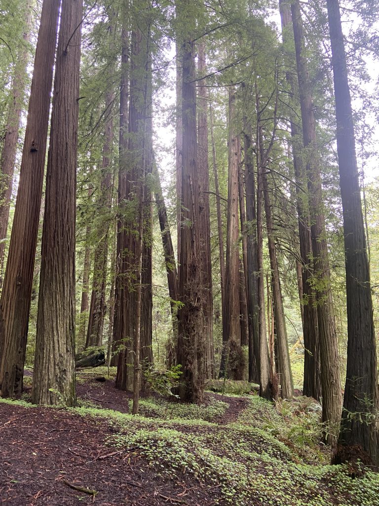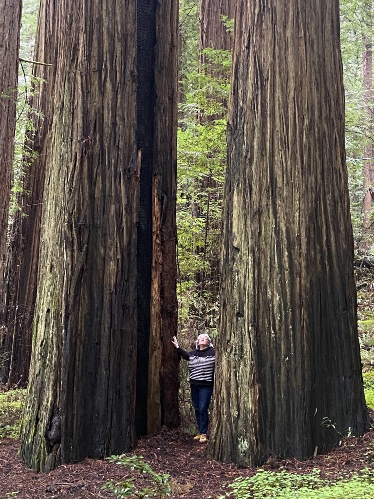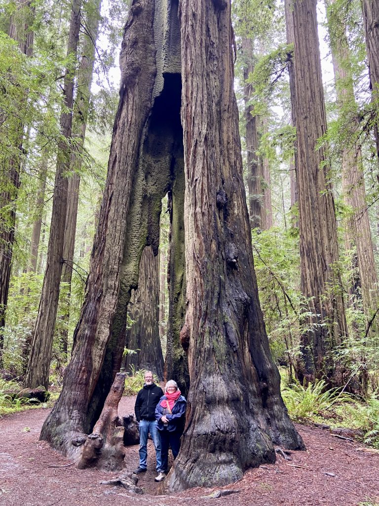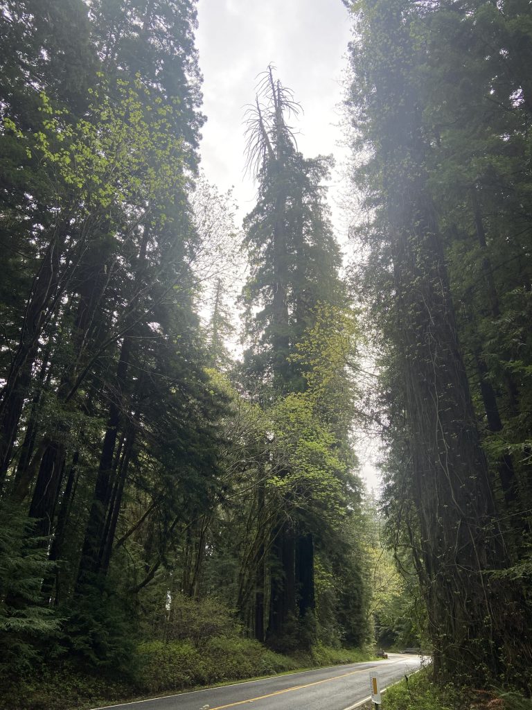 Nous sommes passés en Californie. La côte nord de la Californie est plus montagneuse que celle de l’Orégon, ça monte et ça descend, l’autoroute passe à l’intérieur des terres dans la forêt. Nous traversons des forêts primaires, peuplées d’arbres géants, les plus grands du monde. Certains spécimens ont plus de 2 000 ans et atteignent 110 mètres de hauteur. Ce sont des « redwood », des séquoias semperivens. Ils ne sont pas très larges mais ils poussent droits. La canopée se trouve à 80 mètres au-dessus de nos têtes. C’est certainement un vrai défi pour ces arbres de faire monter l’eau jusqu’à leurs cimes.