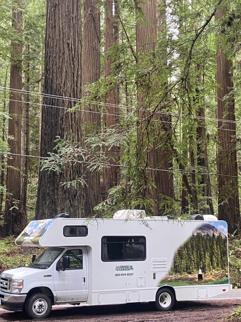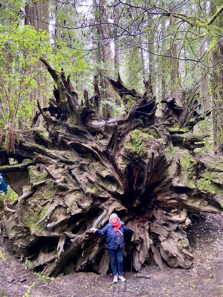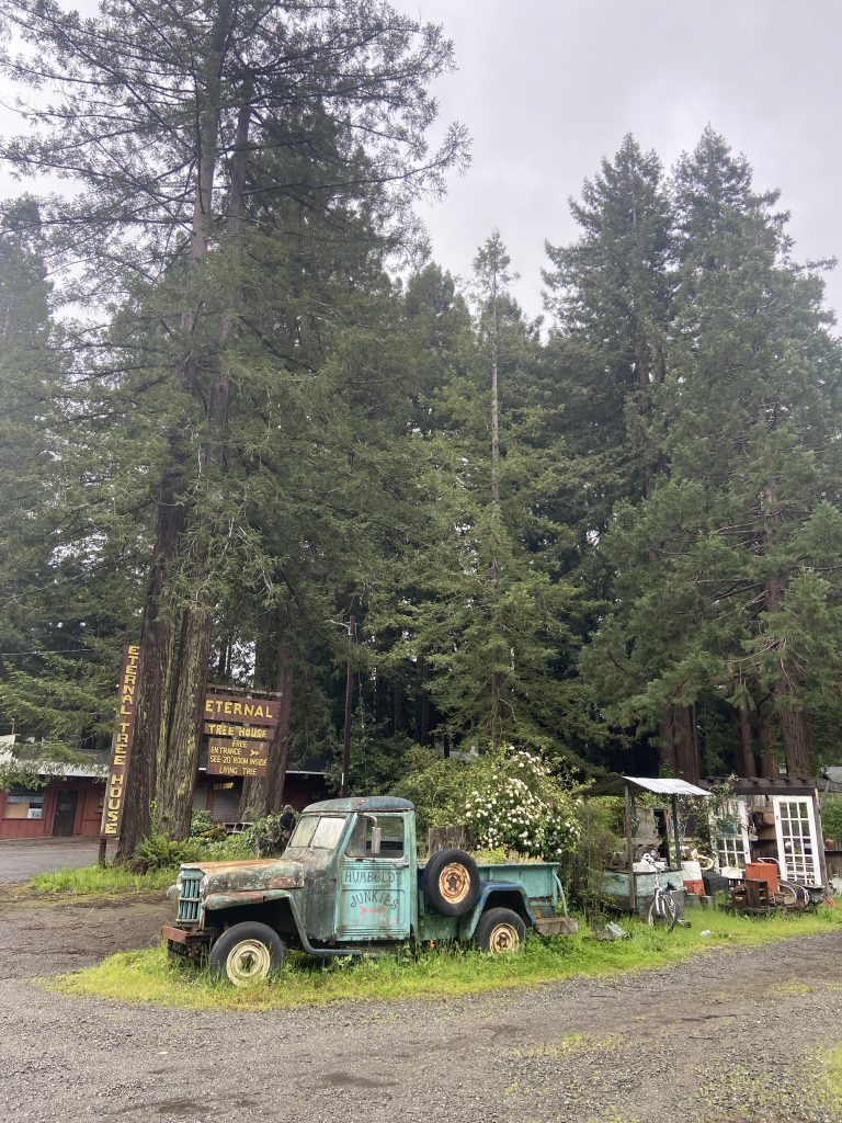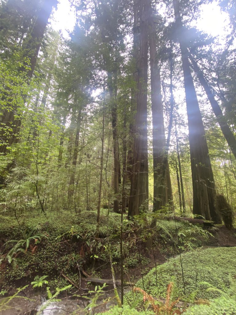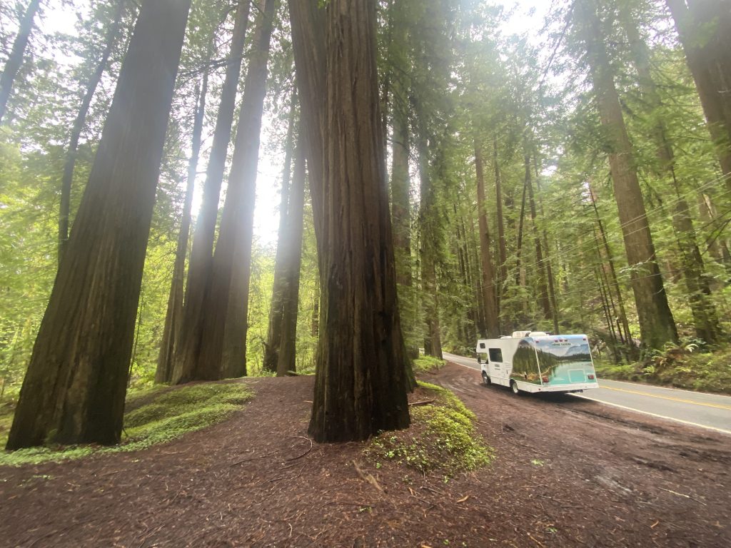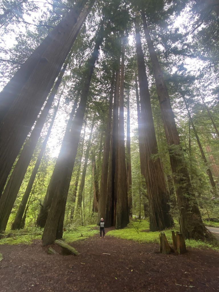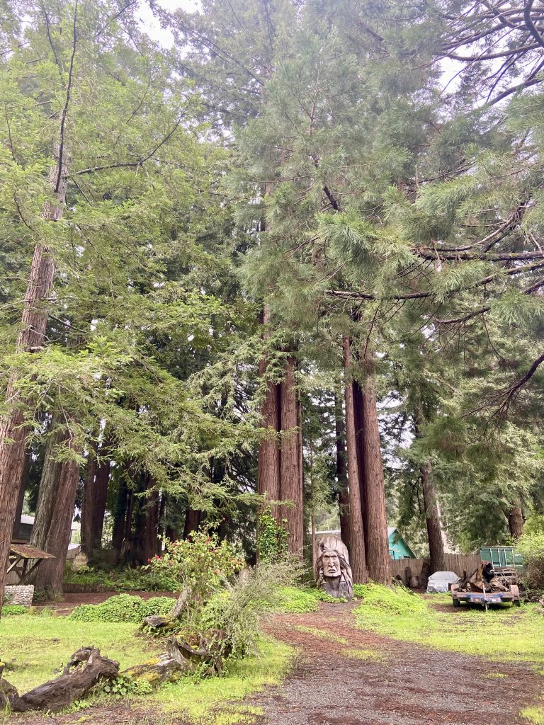 Nous sommes passés en Californie. La côte nord de la Californie est plus montagneuse que celle de l’Orégon, ça monte et ça descend, l’autoroute passe à l’intérieur des terres dans la forêt. Nous traversons des forêts primaires, peuplées d’arbres géants, les plus grands du monde. Certains spécimens ont plus de 2 000 ans et atteignent 110 mètres de hauteur. Ce sont des « redwood », des séquoias semperivens. Ils ne sont pas très larges mais ils poussent droits. La canopée se trouve à 80 mètres au-dessus de nos têtes. C’est certainement un vrai défi pour ces arbres de faire monter l’eau jusqu’à leurs cimes.