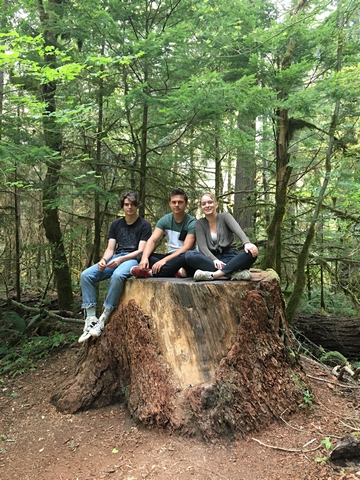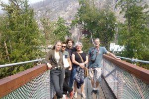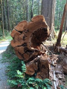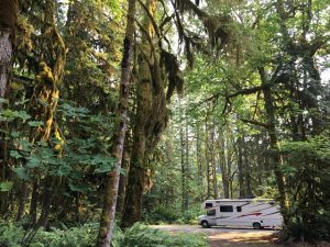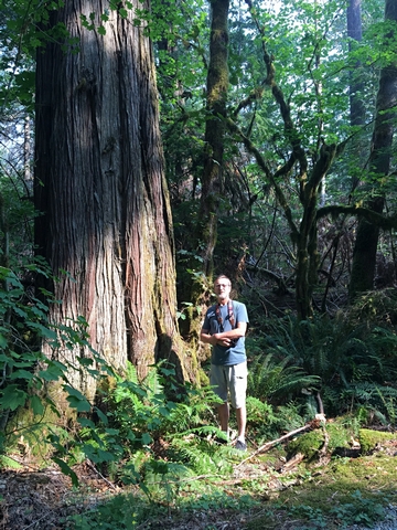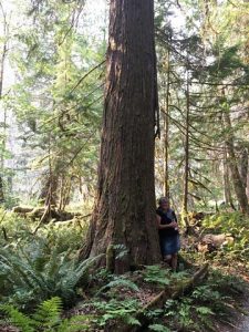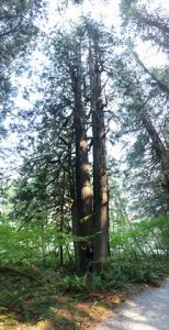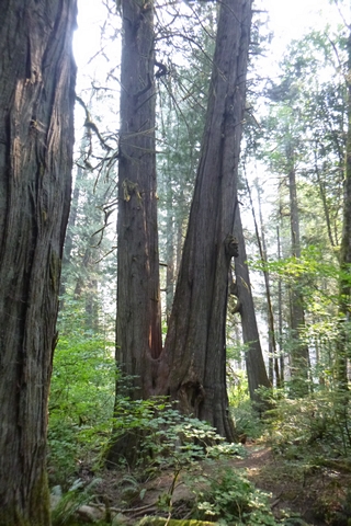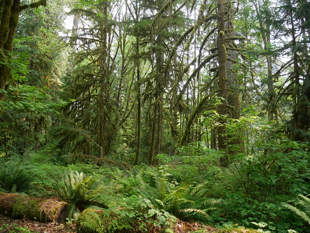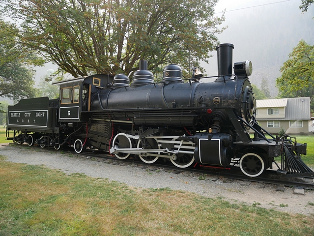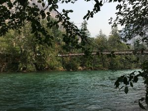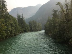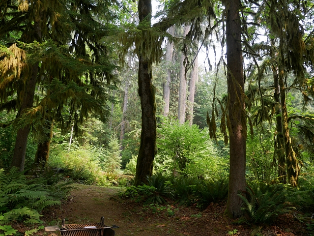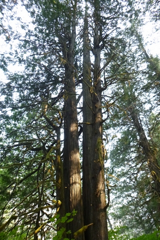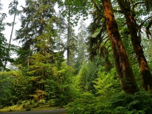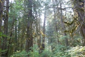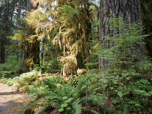 Départ vers 9h30. On s’arrête à Newhalem, à une quinzaine de kilomètres. C’est Seattle city lights : c’est une petite ville entièrement construite par la compagnie d’électricité qui exploite 3 barrages dans le parc. La ville est entièrement faite pour le personnel qui travaille à la centrale. Toute l’électricité produite ici alimente la ville de Seattle. Il y a un information center, Barney, la jeune femme qui y travaille est ravie que nous nous intéressions au coin. Elle ferme son bureau et nous emmène faire un tour. Il y a un pont suspendu au-dessus de la Stagik River, un torrent contrôlé par les barrages. Nous ne sommes pas passionnés par l’histoire de l’hydroélectricité mais elle nous laisse à l’entrée de « Red Ceddar trail », une balade de 40 minutes jusqu’à l’ancien générateur à travers la forêt de cèdres rouges, de douglas, d’hemlocks et d’érables recouverts de mousse. Nous sommes impressionnés par la taille des arbres. Certains font plus de 40 mètres de haut, des troncs font 3 mètres de diamètres. Un tronc tombé à terre fait 1m20 de hauteur, Stéphane compte les cernes, il évalue l’âge de l’arbre à 240 ans. Des panneaux nous expliquent la vie de la forêt. Certains arbres ici ont résisté au terrible incendie de 1920. Ce sous-bois est étonnant. Au retour, on s’arrête dans le « General Store » car il y a du WIFI.