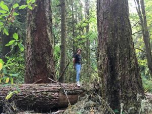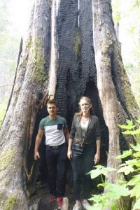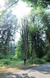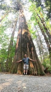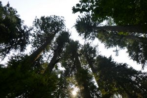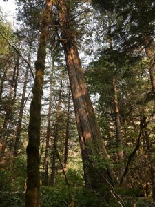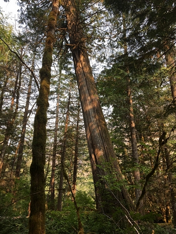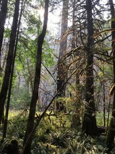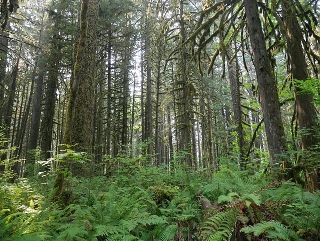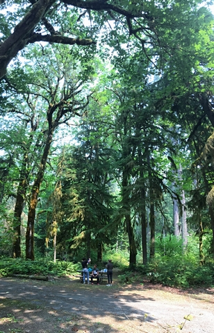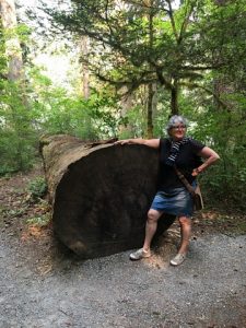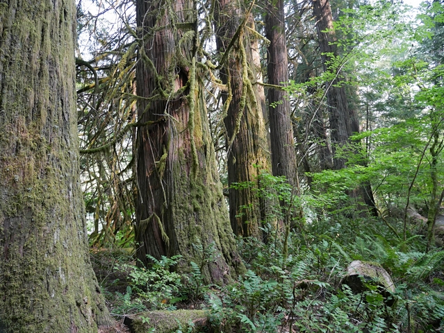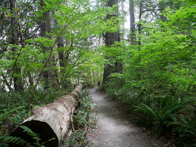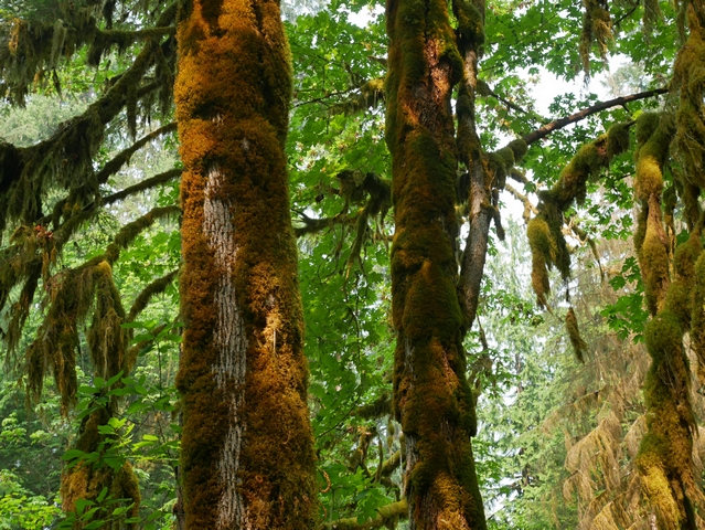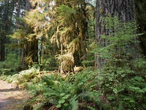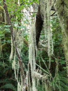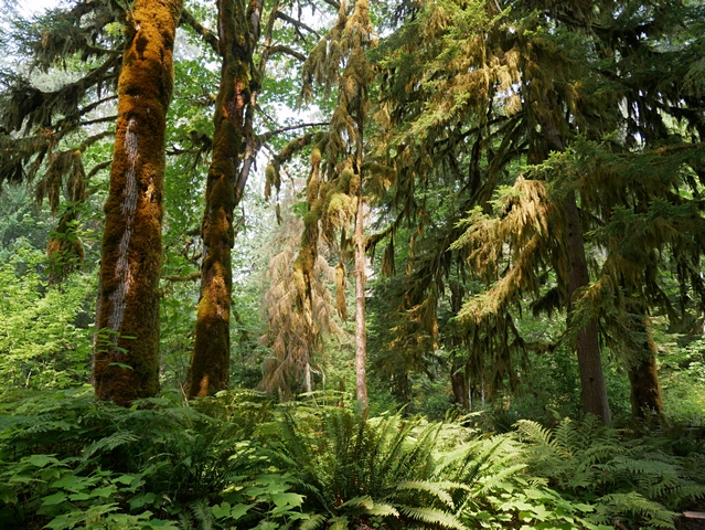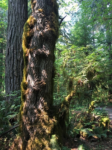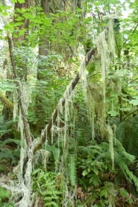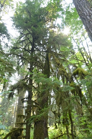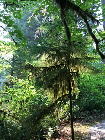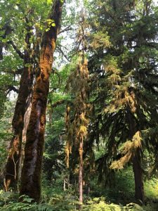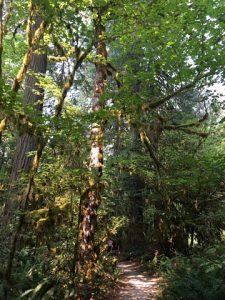 On continue la route et on s’arrête à Rockport State Park pour déjeuner. On est dans un ancien camping transformé en parc. Là encore, on est dans une forêt d’arbres immenses. Nous faisons une balade sur un sentier d’interprétation : la loop interpretative trail. Les arbres sont encore plus imposants que ce matin. C’est magnifique. Les arbres sont recouverts de lichen. A certains endroits, les arbres sont tapissés de mousse verte, à d’autres le lichen plus clair pend comme des guirlandes. Les feuillus en particulier (des érables) en sont recouverts. Les lichens ne supportent pas la pollution, nous sommes donc dans un espace pur et préservé. On a le tournis à force de renverser la tête pour voir les cimes. Certains arbres sont morts, leurs troncs imposants au sol alimentent la terre et toute la faune qui s’y terre. C’est magique.