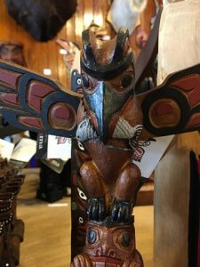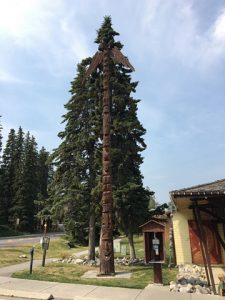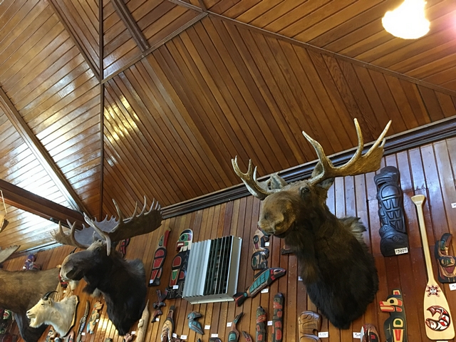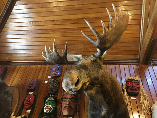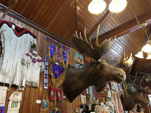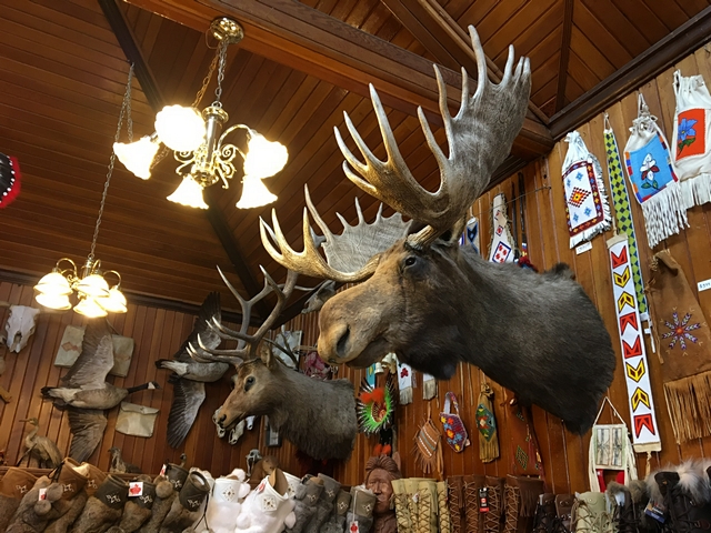 Bon, on se gare dans le parking RV de Banff. C’est chaud, Steph est devenu expert. On décide d’aller à pied à « Cave & Basin » à pied, les bassins de sources thermales. On passe devant un magasin d’artisanat indien authentique et étonnant. Il y a des têtes d’animaux empaillés et même dans une vitrine le squelette d’une soi-disant « Mermaid », une sirène du lac Minnewanka. Elle n’a rien de sympathique. Il y a là des bijoux, des couteaux, des attrape-rêves, des chaussures et des vêtements pour temps extrêmes qui ont l’air d’excellente qualité. Je trouve mon bonheur : un sac besace en cuir de bison.