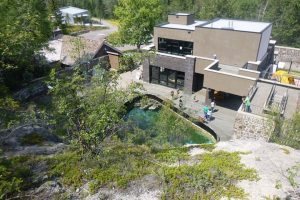 L’après-midi on monte sur les hauteurs où sont installés les bains. Comme à Jasper, une piscine d’eau chaude (39°) à ciel ouvert avec vue sur les montagnes. Nous nous baignons. C’est très chaud et par forcément agréable. Il fait également très chaud à l’extérieur. Il est conseillé de ne pas rester dans l’eau plus de 10 minutes. On peut sortir, prendre une douche froide et rerentrer ! En hiver, avec de la neige tout autour, les sensations doivent être différentes !