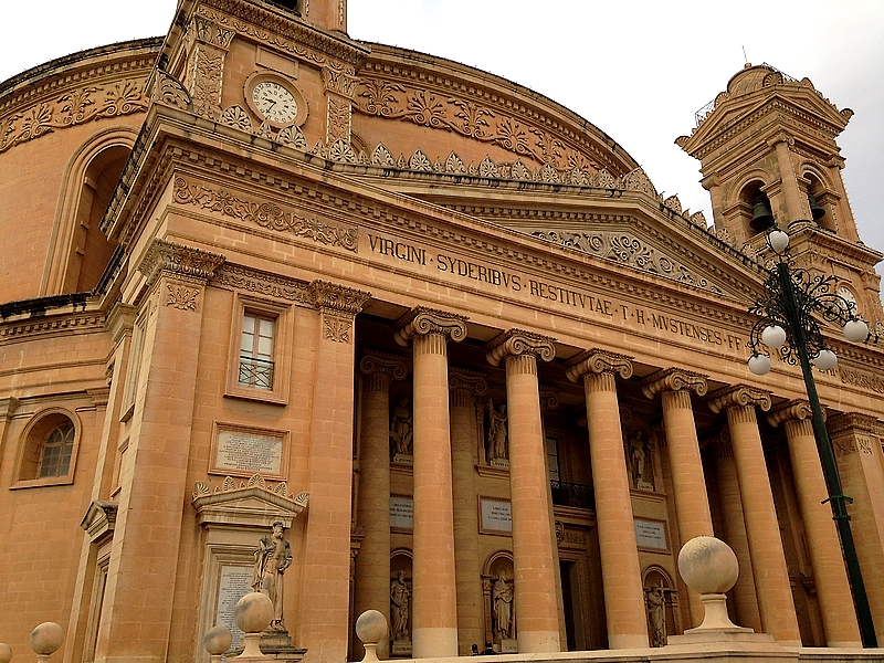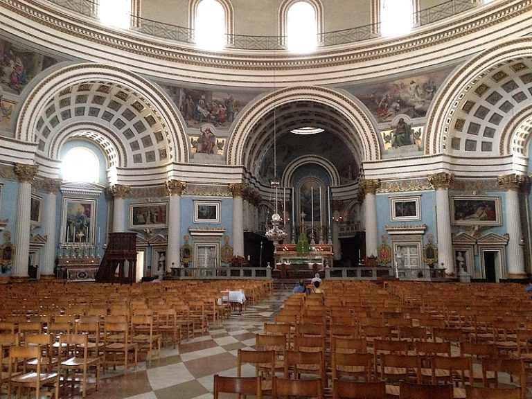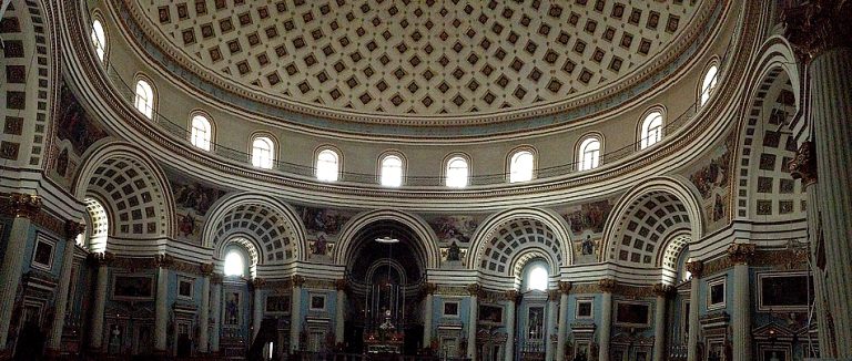 Le dôme de Mosta, dédié à l’Assomption, est le troisième plus grand dôme au monde. L’église, plus connue sous le nom de rotonde Sainte-Marie, a failli être détruite lors de la Seconde Guerre mondiale – une bombe de la Luftwaffe allemande a transperçé le dôme de l’église mais sans jamais exploser, tandis que deux autres bombes ont rebondi sur le dôme avant d’atterrir dans le square sans jamais exploser elles non plus. Une réplique de la bombe a été installée à l’intérieur de l’église comme mémorial dédié à ce « miracle ».
