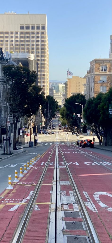 Prendre les transports en commun est aussi une aventure en soi. Le « câble car » est un tramway plutôt touristique qui grimpe des rues très pentues, le tramway circulaire à un côté vintage, il y a aussi les bus et le métro très moderne. Comble de la modernité, des taxis autonomes sans chauffeur partout dans la ville. On les reconnait à leurs capteurs sur le toit et les côtés. On les observe s’insérer dans la circulation, se garer et même klaxonner !