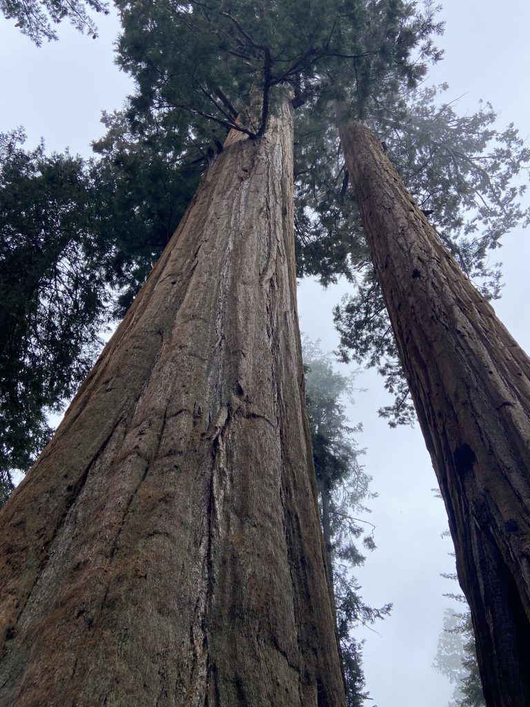 Nous sommes toujours dans les nuages. 5 degrés ce matin, au camping, il pleut. Notre destination : la forêt des géants dans Séquoia Park. Une heure de route, dans le brouillard. Arrêt à « General Sherman Tree », l’arbre le plus gros au monde, pas par sa hauteur (84 m) ni par sa circonférence (31 m) mais par son volume (1487 mètres cubes !). Il est âgé de 2200 ans. Le séquoia est considéré comme géant quand son tronc n’est plus conique mais droit. Une rando d’une heure nous permet ensuite d’admirer une concentration de séquoias géants. Ils sont tellement grands qu’ils ne rentrent pas dans les photos, on est obligés de faire des vidéos ! Ils poussent parfois par deux ou en bosquet et partout les stigmates des feux mais toujours debout grâce à ça.