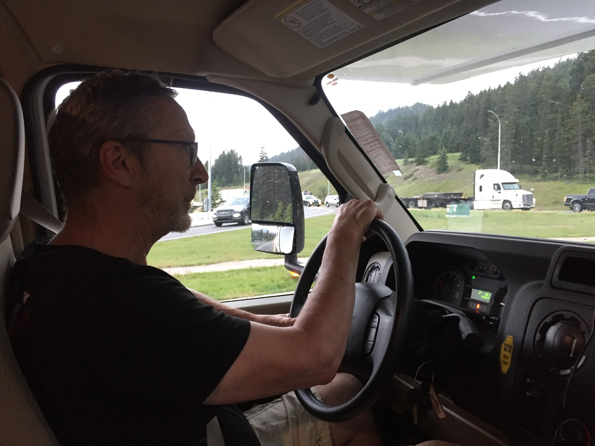 14h. On est prêts à partir. L’autoroute n’est pas loin. Après quelques hésitations, on démarre. On rejoint l’autoroute 1, celle qui traverse le Canada d’est en ouest. Elle est large mais le trafic est dense. Les voies de gauche sont parfois des sorties obligatoires. On tombe sur des travaux… C’est un vrai bizutage, mais Stéphane assure comme un chef même s’il est très tendu. Il cherche constamment le levier de vitesse et le frein à mains. C’est une boite automatique !