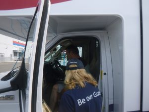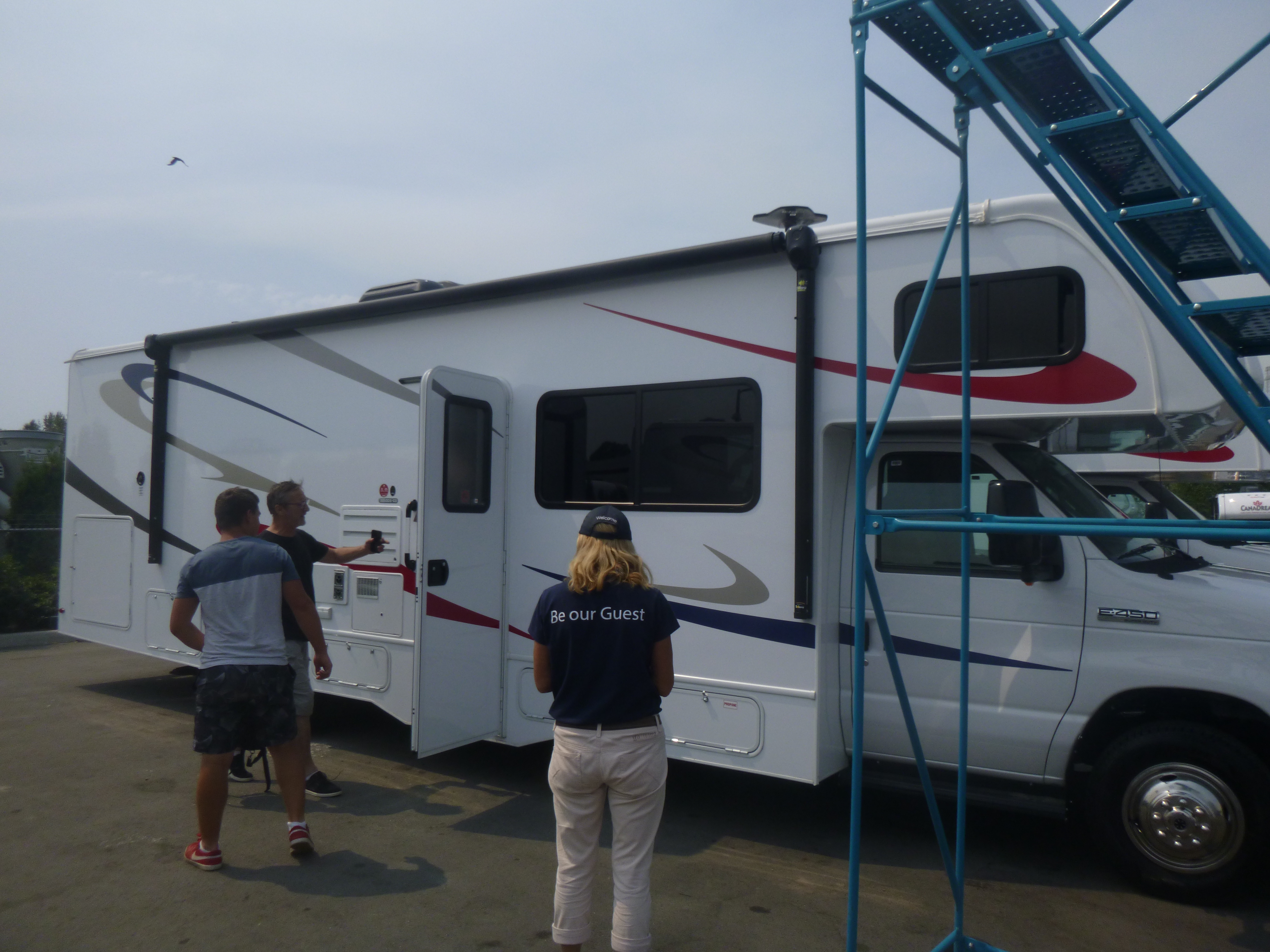 On passe plus d’une heure avec Rita qui nous explique tout, on inspecte l’extérieur puis l’intérieur. Loïs et Steph suivent les instructions : essence (Gazoline), électricité, gaz propane, génératrice, réservoirs (eaux blanches, grises et noires). Rita m’explique la cuisine : plaques, four traditionnel, hotte, micro-ondes, frigo, congélateur. Stéphane s’installe au volant, manœuvre le levier de la boite automatique avec Rita.