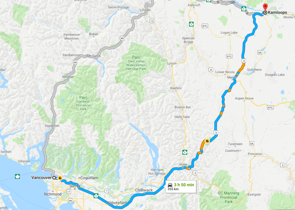 Et si on mangeait ? Le petit déjeuner, c’était à 6h ! On ne s’est même pas rendu compte à quel point on avait tous faim ! Il y a un Doner’s Kebab, on mange à toute vitesse. On a encore de la route à faire. Finalement, on devrait pourvoir aller jusque Kamloops. Il reste un peu plus de 200 kms.