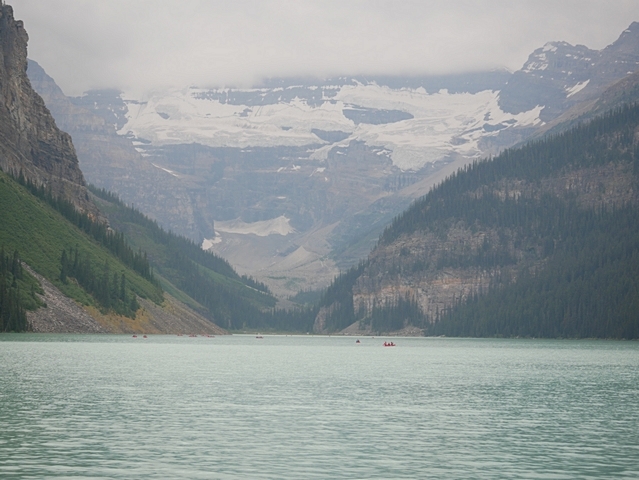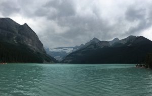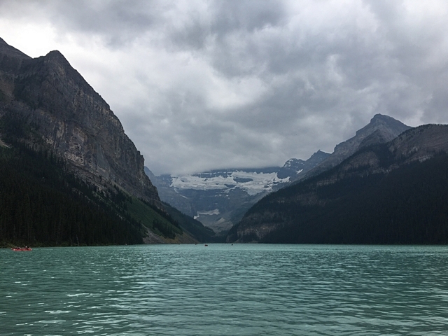 Déjeuner au camping. On étudie la carte et le guide. On va être obligés de faire de la route. On doit faire quelques courses également. Après une petite sieste, on retourne à Lake Louise village (40 kms). Objectif : Lake Moraine. Problème : la route est fermée, il y a trop de monde. On n’a pas le choix : ce sera Lake Louise qu’on voulait faire demain matin pour la lumière. Aïe aïe aïe ! On n’est pas seuls ! Le lac Louise est l’attraction du coin, voire de tout le Canada ! Le premier parking est complet. C’est rempli de touristes. Le lac est vraiment un endroit magique, d’une couleur turquoise, entouré de montagnes, avec un glacier dans le fond. Il n’est dégelé que 2 mois par an. Je me souviens être venue ici il y a 30 ans. J’ai fait du patin à glace sur ce lac. Il est au bout d’une route et il y a un immense hôtel (2000 personnes) en bordure. On cherche à emprunter un sentier pour s’éloigner de la foule qui se prend en photo devant le lac. Il se met à pleuvoir, nous rebroussons chemin et entrons dans l’hôtel luxueux. Il y a quelques boutiques accessibles aux touristes, tout est hors de prix et surfait.