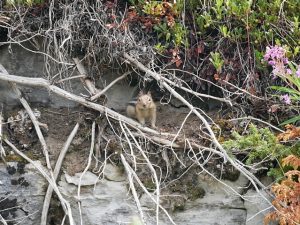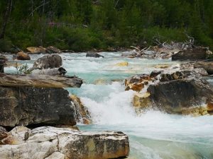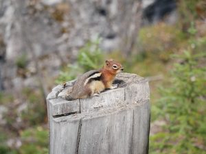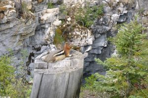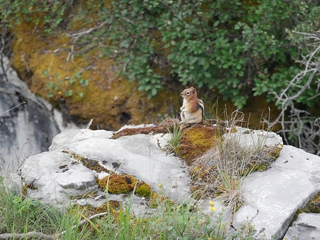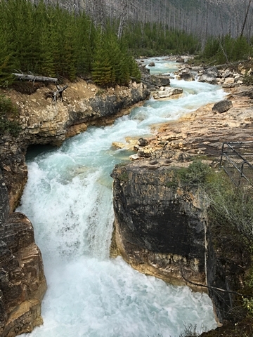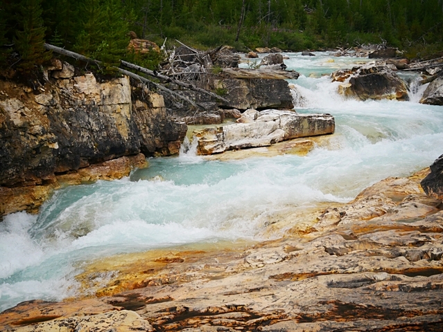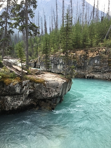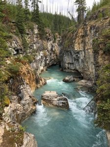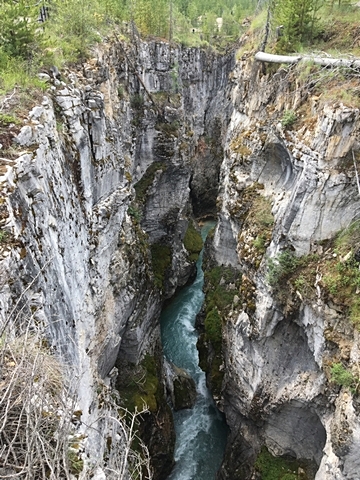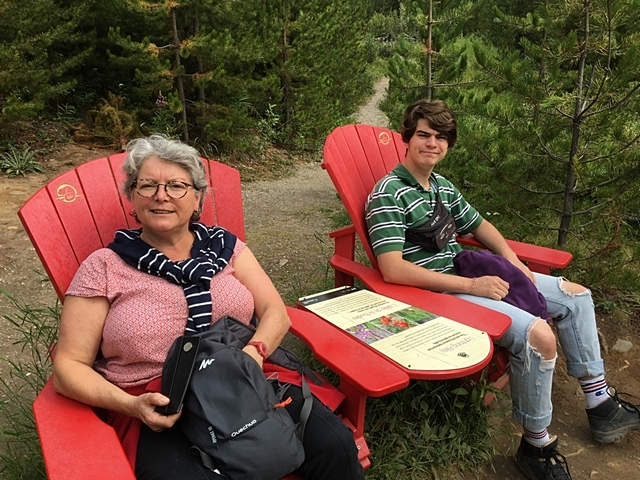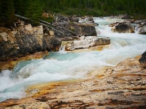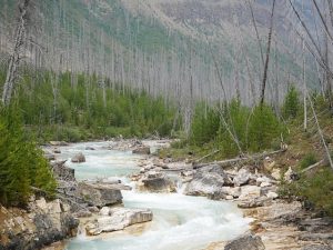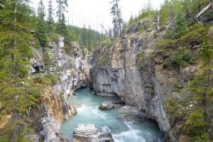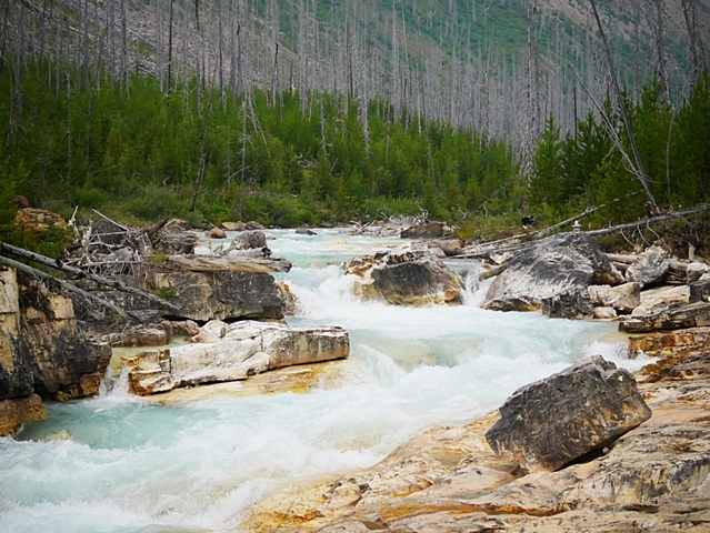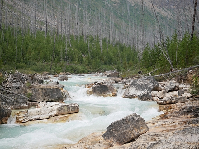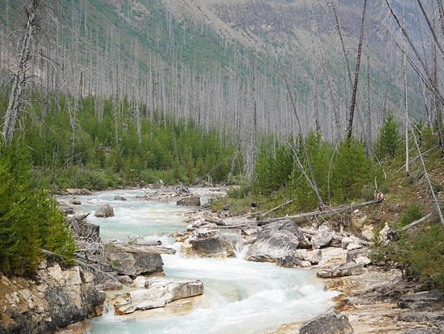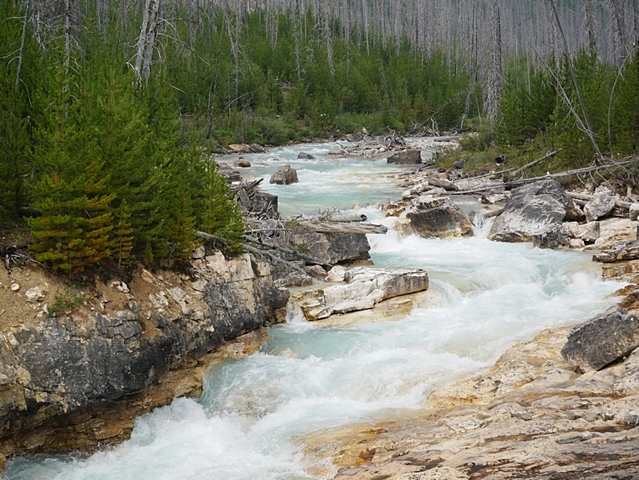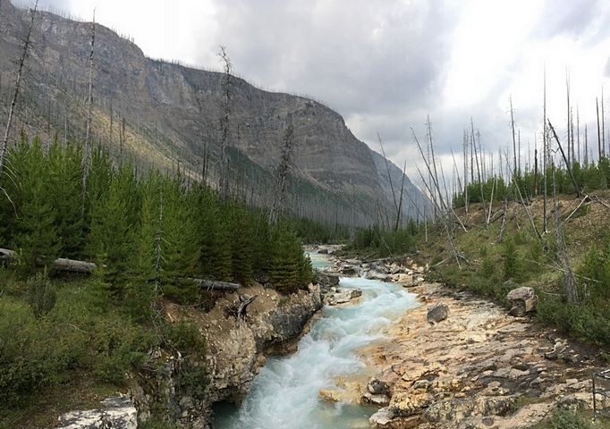 On se met en route vers 9h à la recherche d’un camping situé entre Lake Louise et Banff et qui nous permettra de rayonner. Au Visitor’s Center, on nous a prévenus : attention, c’est un grand week-end. Le premier camping semble complet, des gens vont peut-être partir mais nous ne sommes pas les seuls à tourner. Steph maitrise parfaitement le camion. Il peut se garer en marche arrière, faire des demi-tours sur la route… On décide d’aller plus loin, vers Marple Canyon campground sur la 93. La route est fermée car il y a un feu mais le camping est une zone accessible. Une route d’une trentaine de kilomètres, en pleine montagne, personne à l’horizon, y compris dans le camping. Le coin est joli mais pas très chaud. Le ciel est couvert et ça sent le brûlé. L’incendie ne doit pas être loin. Nous avons refranchi la frontière de la province de l’Alberta et nous sommes en Colombie Britannique dans le parc de Kootenay.