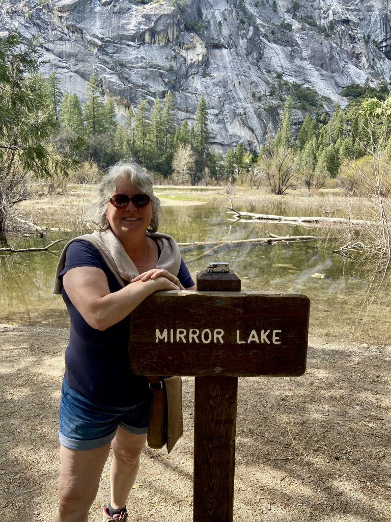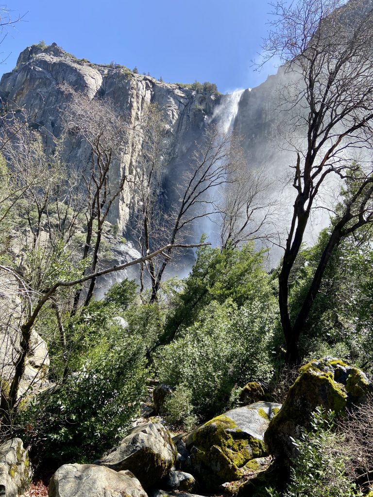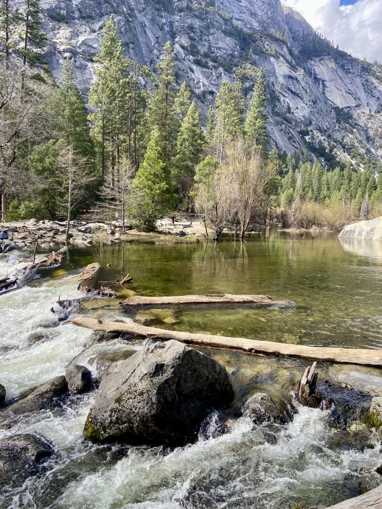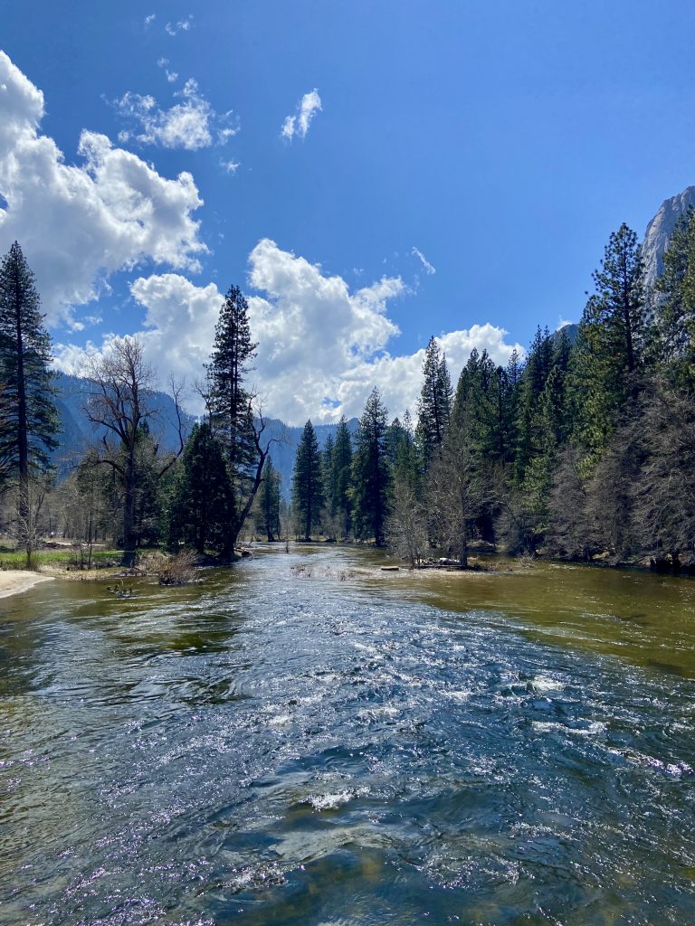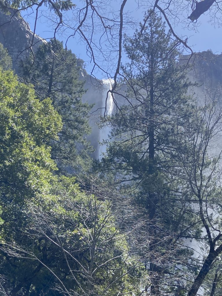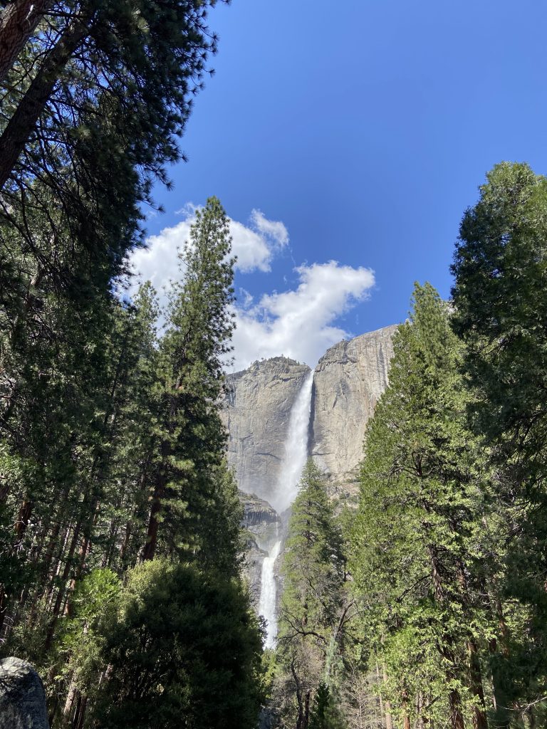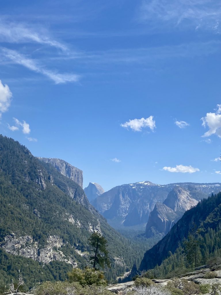 Dans le parc de Yosemite, on visite principalement la vallée de Yosemite, une vallée de 13 kms de long et 1,6 kms de large. On y entre par un tunnel et dès la sortie du tunnel, on est saisi par la vue grandiose sur les imposants rochers de granit, les sommets qui avoisinent les 3000 mètres d’altitude et les cascades dont le débit est très important en cette saison.